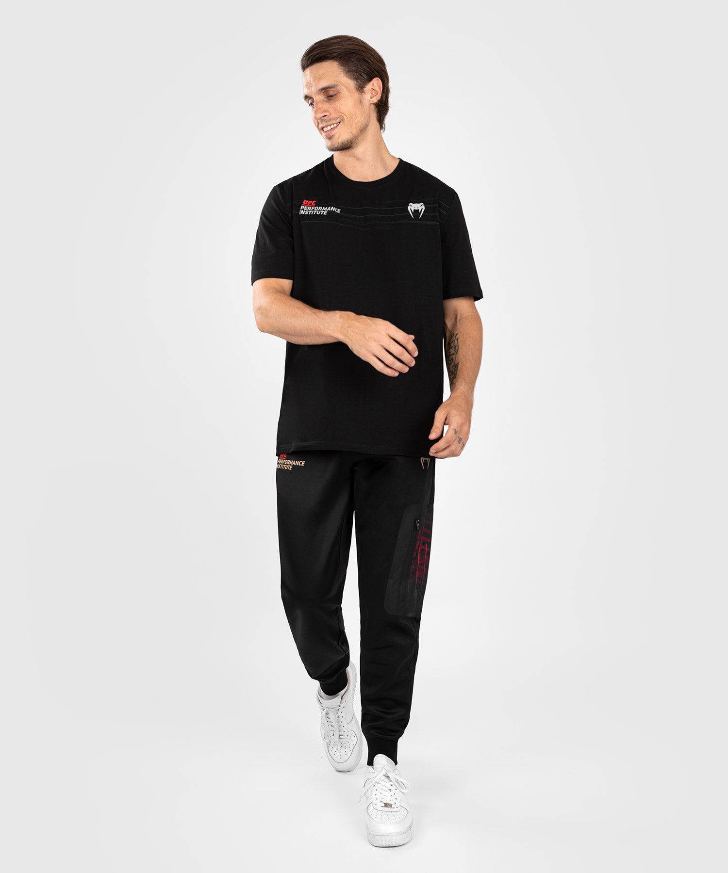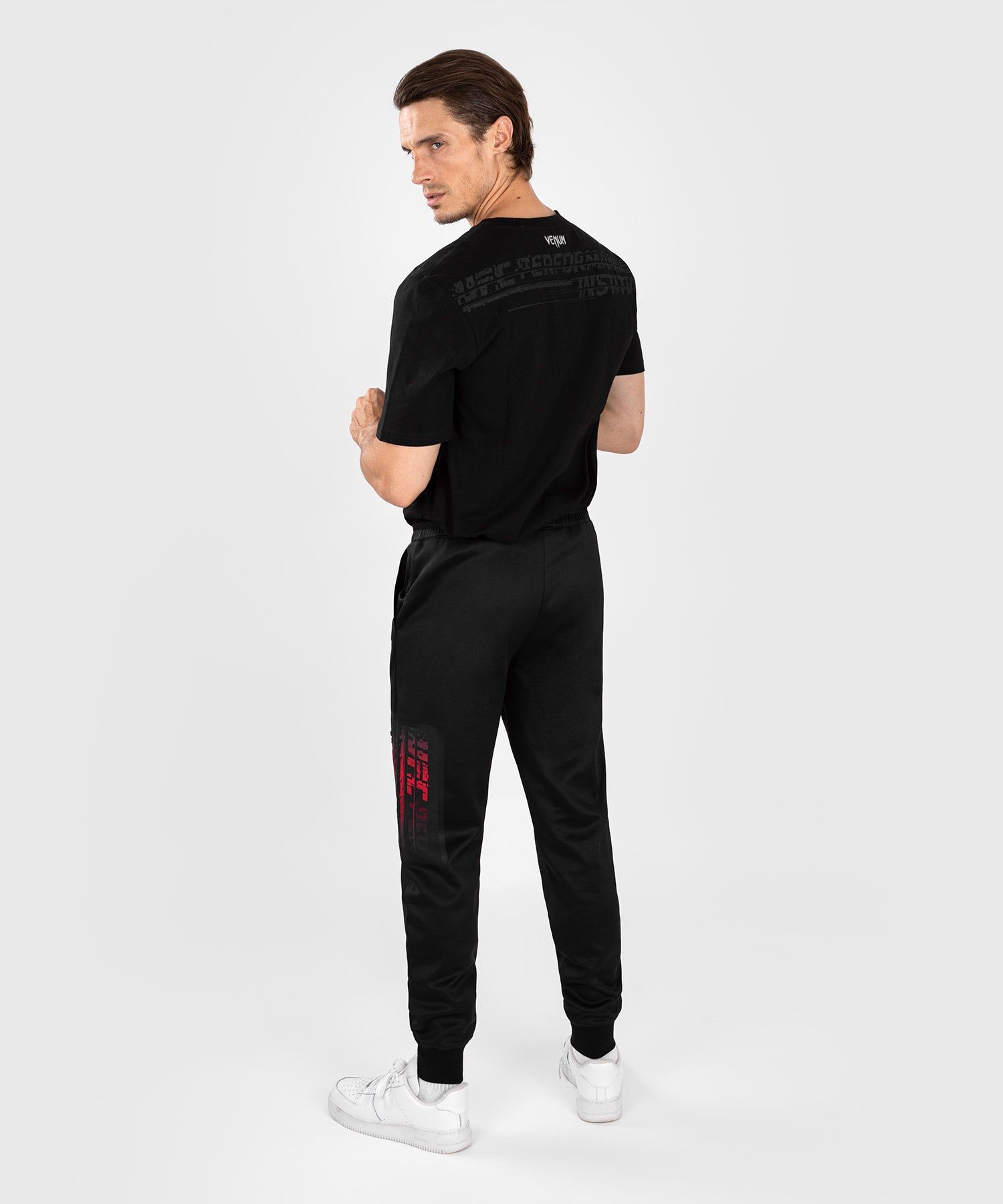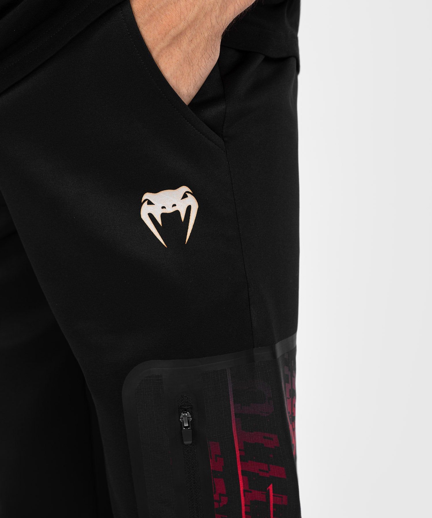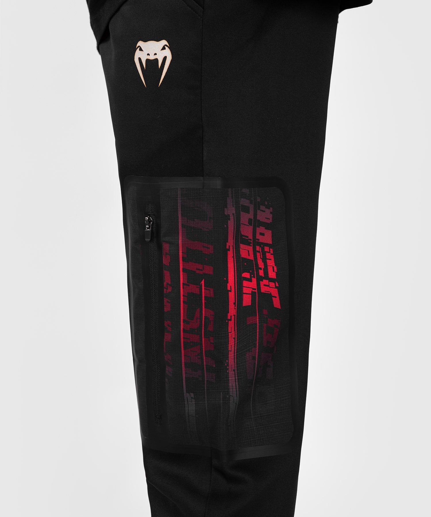 这条黑色优质卫裤的左裤腿处印有该系列的动态图案设计,腿部印有 UFC Performance Institute和 VENUM的标识。腰部对比鲜明的红色抽绳为裤子增添了一抹亮色。
