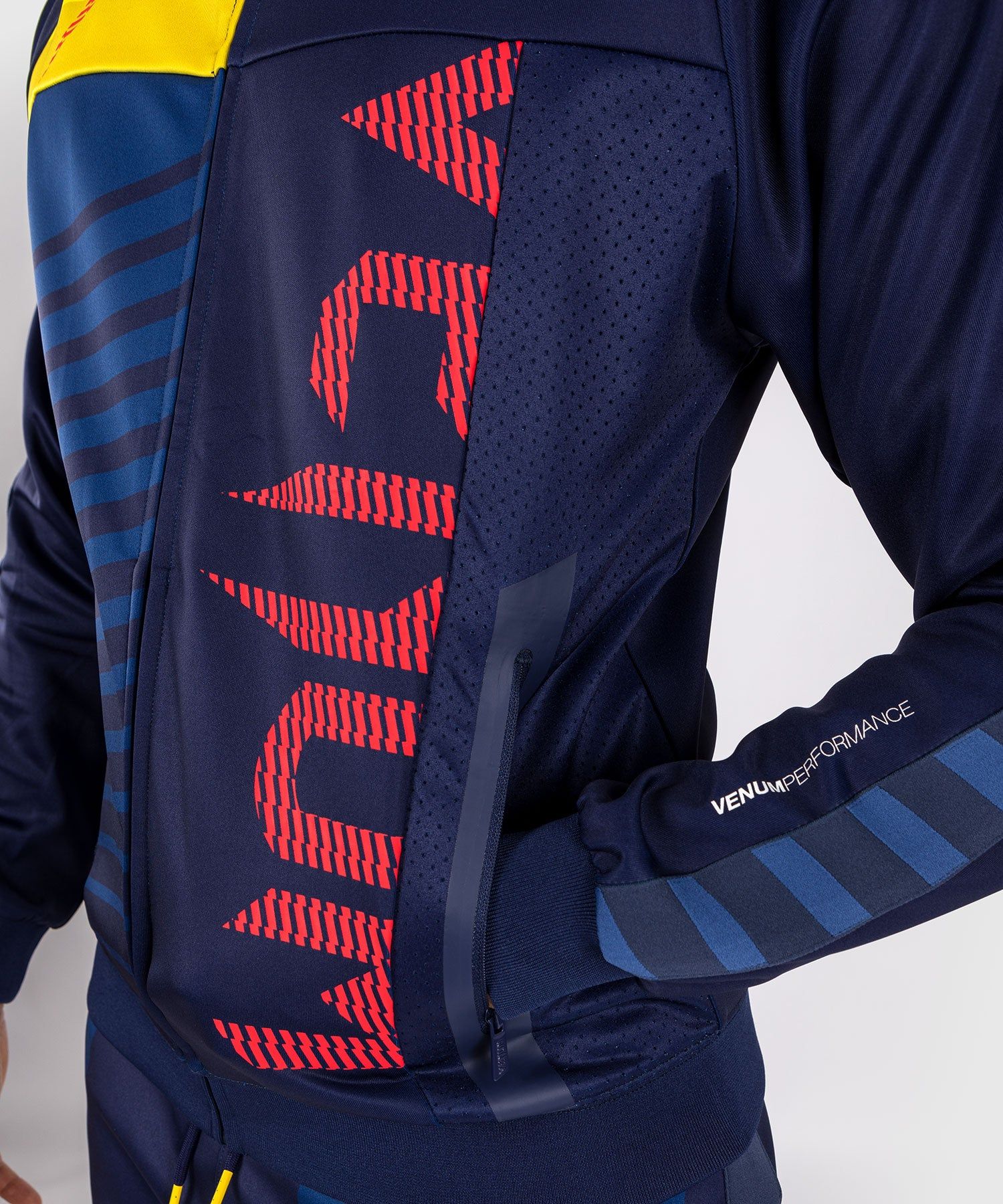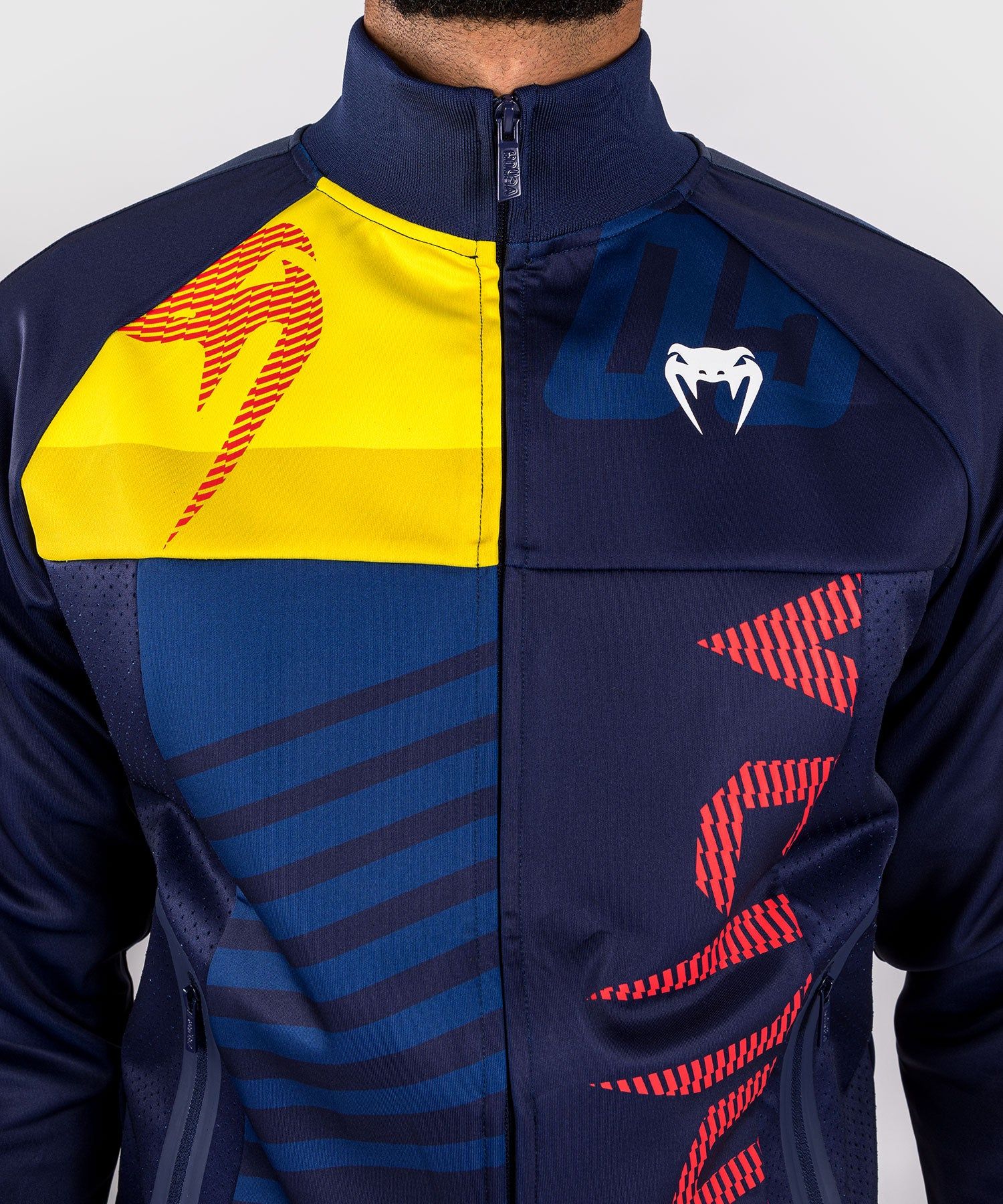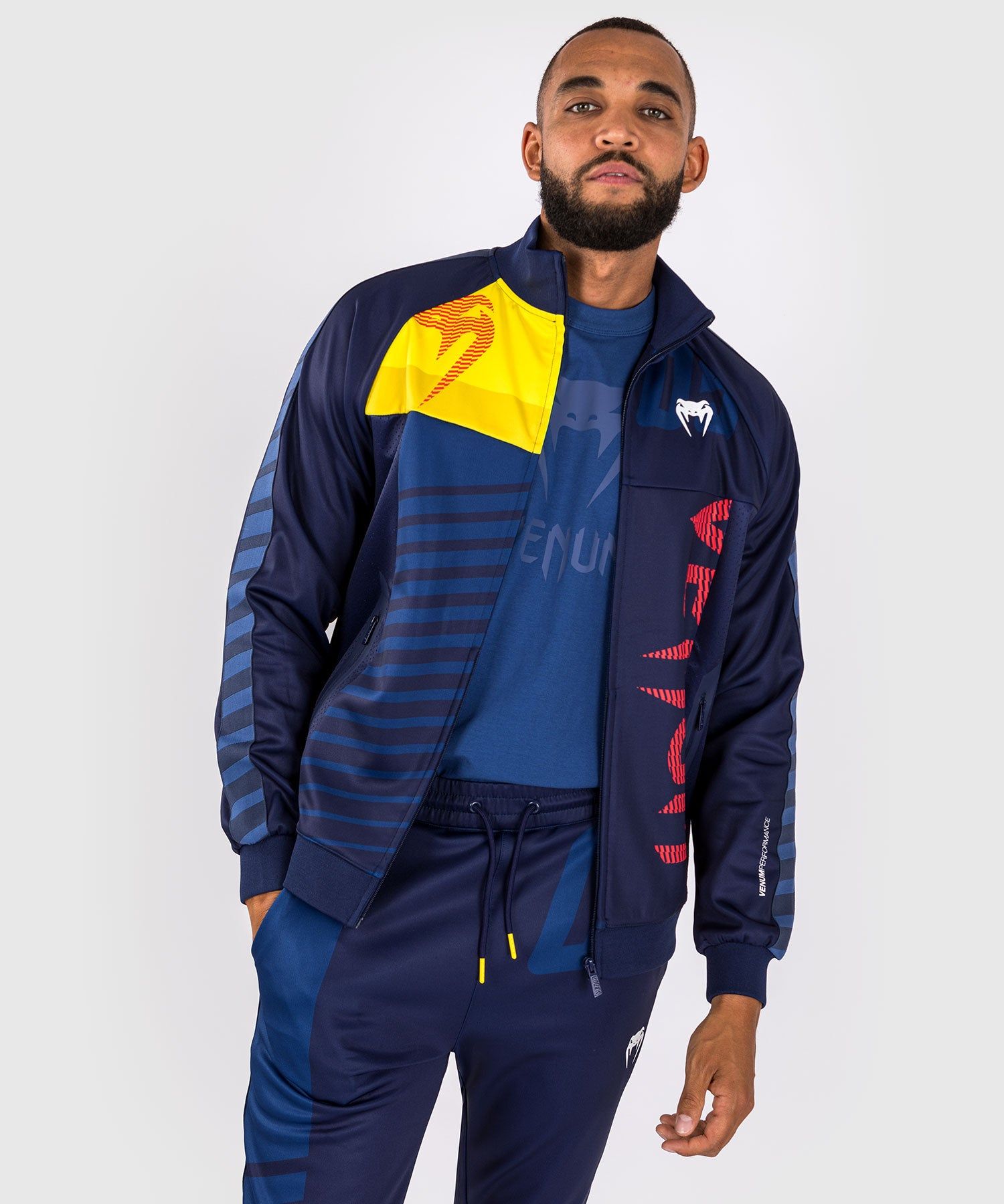 这款运动夹克的腰部和袖口均有松紧带,还设有拉链侧袋。胸前、后颈和袖子上有白色的VENUM徽标细节,与海军蓝、黄色和红色的图案设计形成鲜明对比。