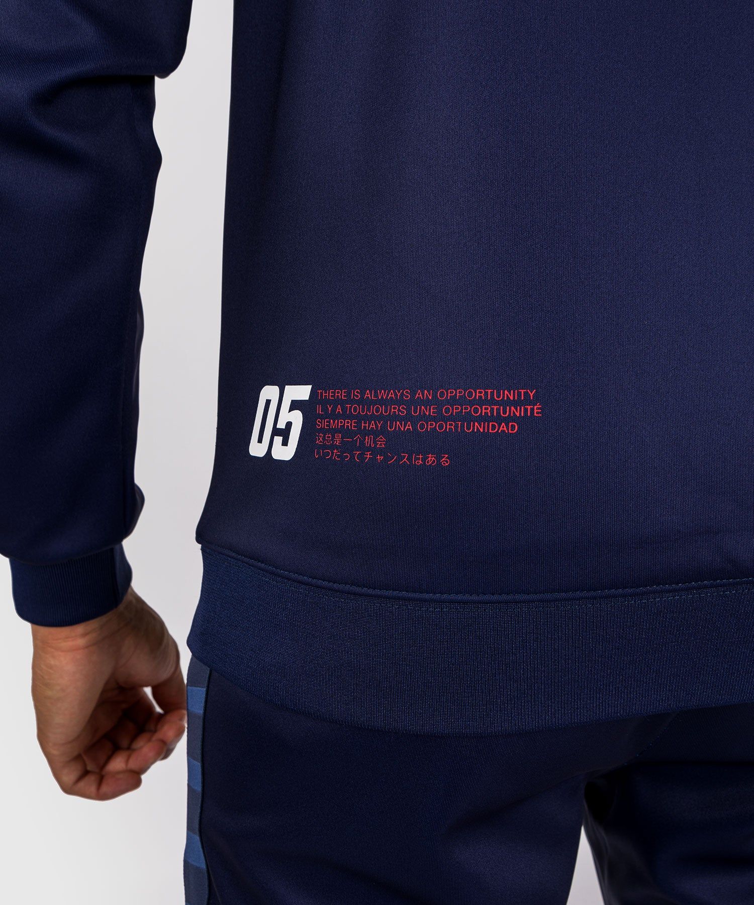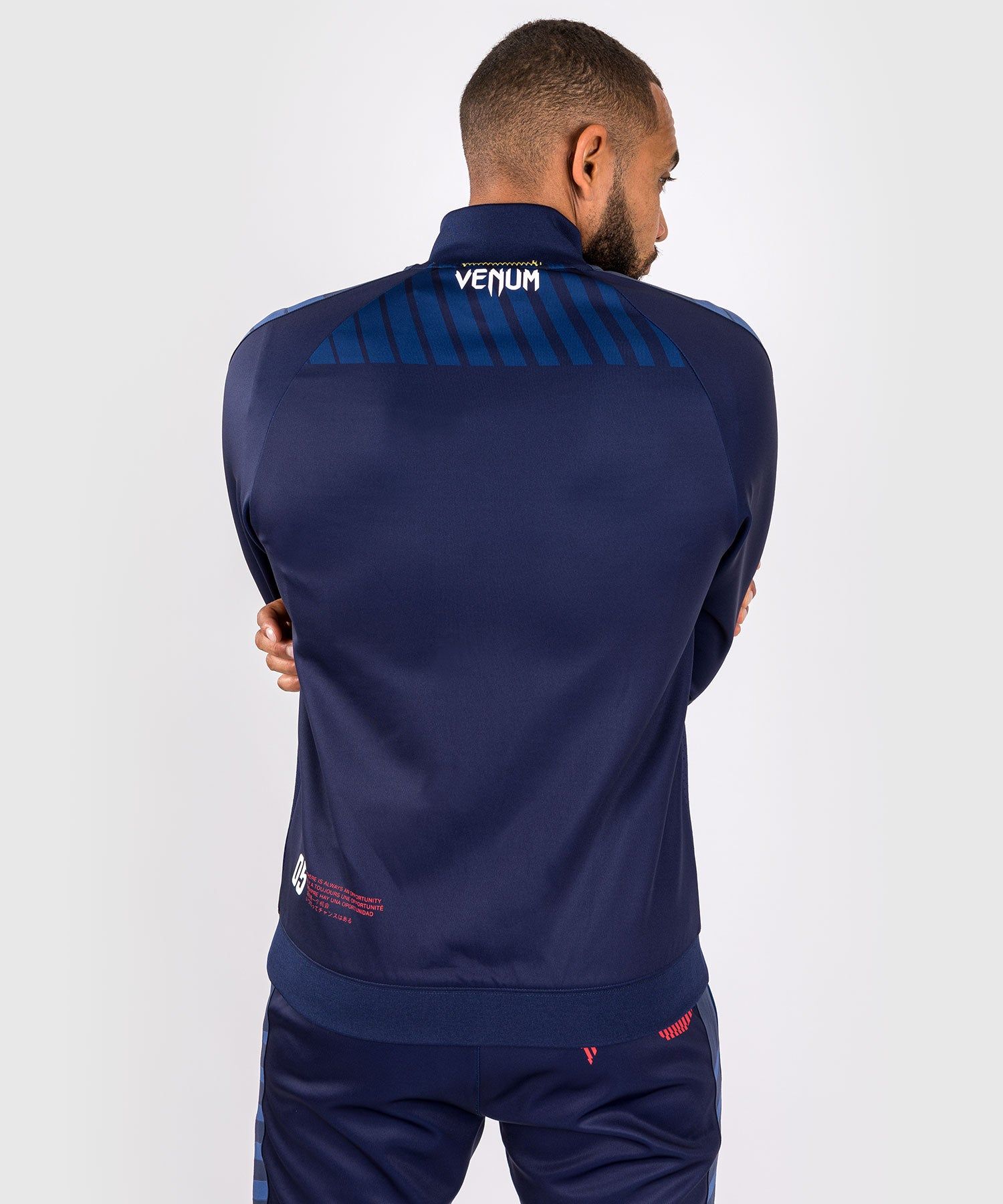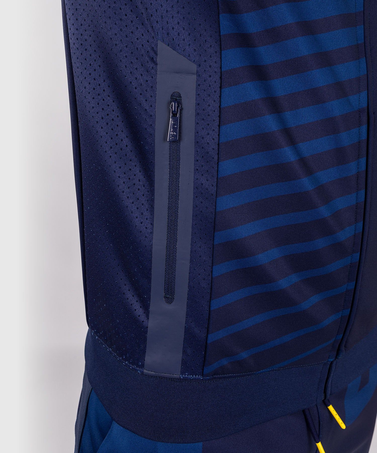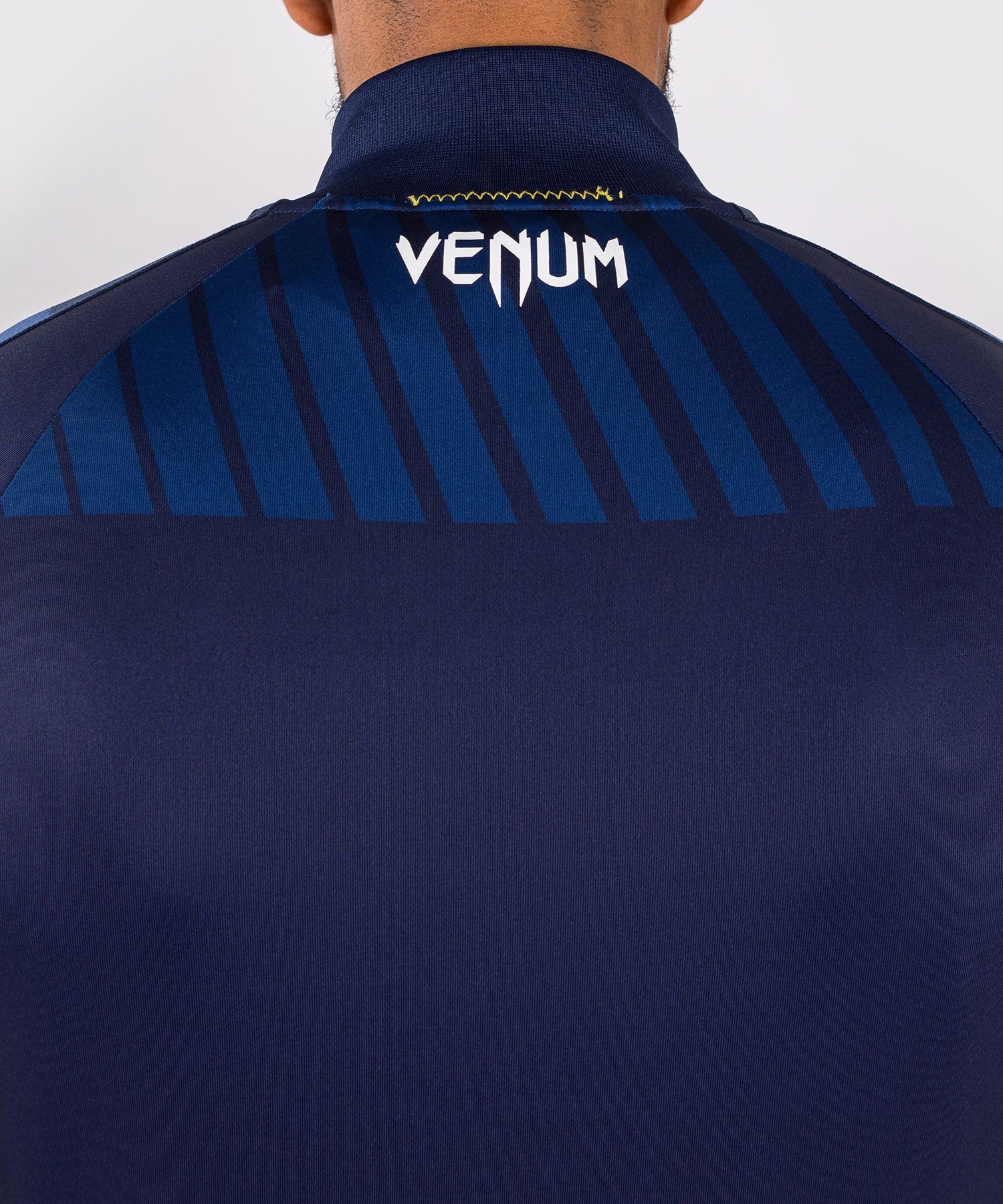 这款运动夹克的腰部和袖口均有松紧带,还设有拉链侧袋。胸前、后颈和袖子上有白色的VENUM徽标细节,与海军蓝、黄色和红色的图案设计形成鲜明对比。