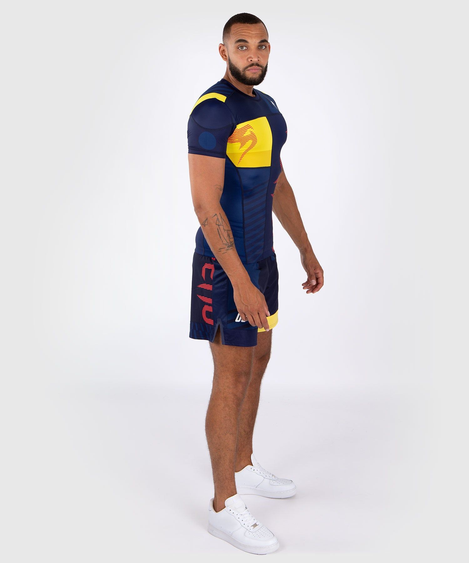 紧身衣下摆硅胶腰带可以防止在训练过程中滑动,让您专注于自己的表现。胸前和后颈部有白色的VENUM徽标细节,与海军蓝、黄色和红色的图案设计形成鲜明对比。