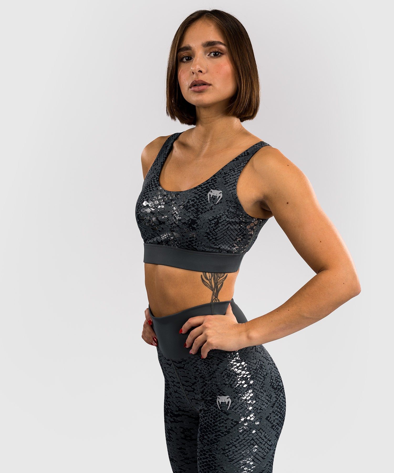 VENUM Amazonia 女士运动内衣采用引人注目的不对称后背设计,肩带相互交错。全新的配色搭配金属细节为经典蛇皮印花增添高级质感,打造独特的VENUM 套装。这款中等冲击力的运动内衣适合拳击、有氧运动和健身房锻炼。