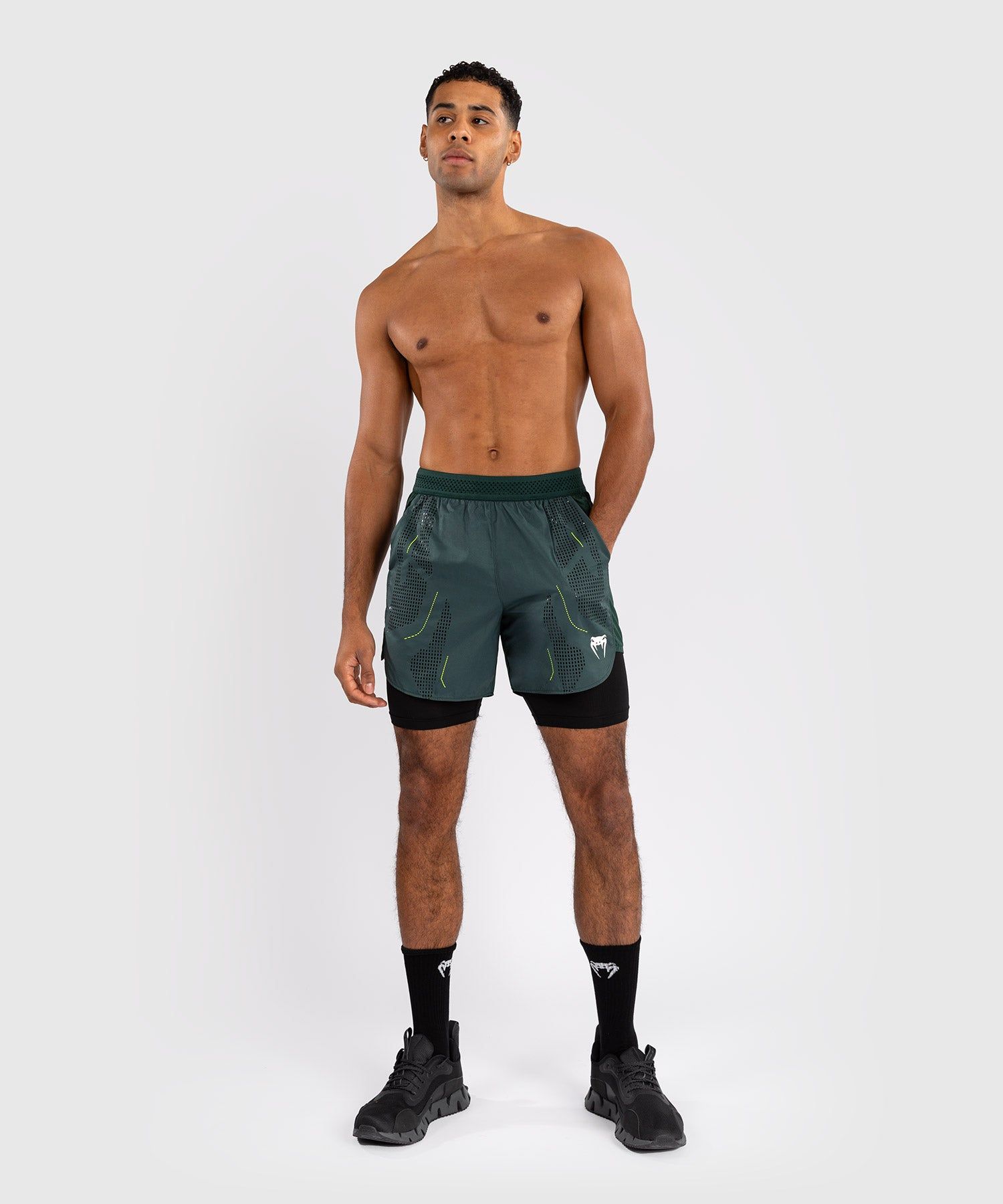 VENUM Technical 3.0训练短裤是一款多功能高性能短裤,非常适合健身房穿着。这款短裤采用二合一设计:内层采用压缩面料提供支撑,外层采用轻质透气面料,弹力恰到好处,让您运动自如。时尚未来感设计与大腿处的VENUM徽标相结合,让您在健身房中脱颖而出。