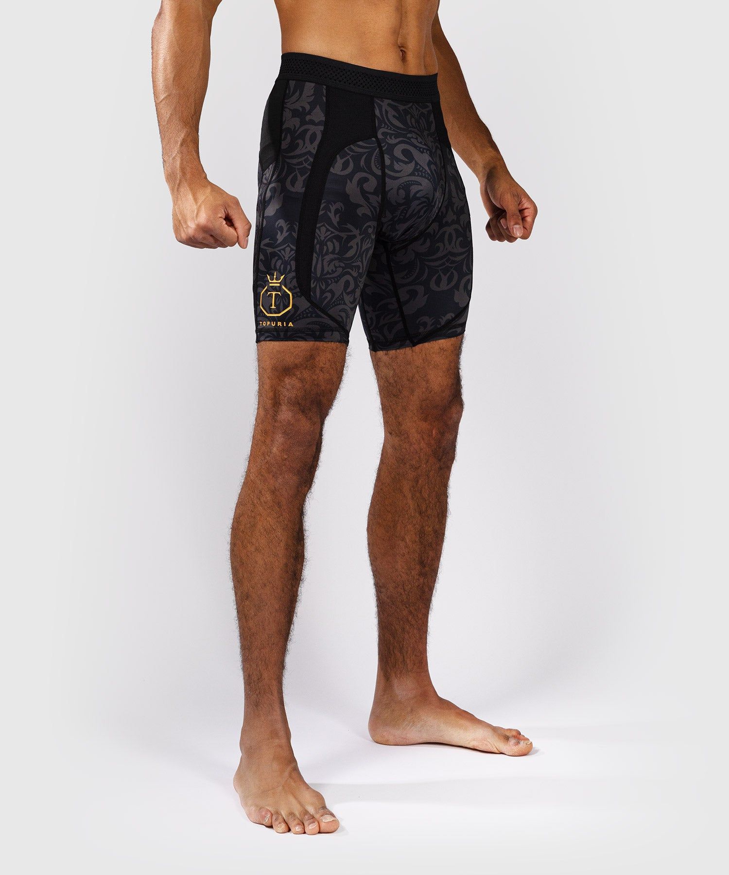 VENUM x Ilia Topuria Unmatched 紧身短裤采用高弹压缩面料制成,既提供支撑又确保活动自由。适度的压缩设计有助于促进血液循环并加速恢复。华丽的黑金配色设计象征着这位备受喜爱的VENUM运动员和UFC冠军的辉煌崛起与统治。