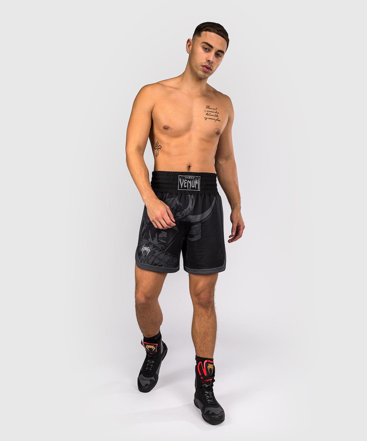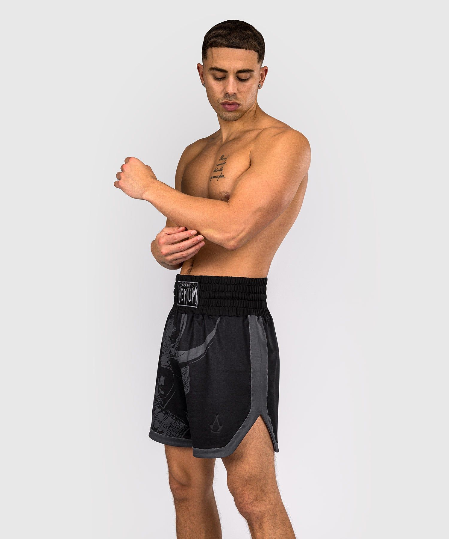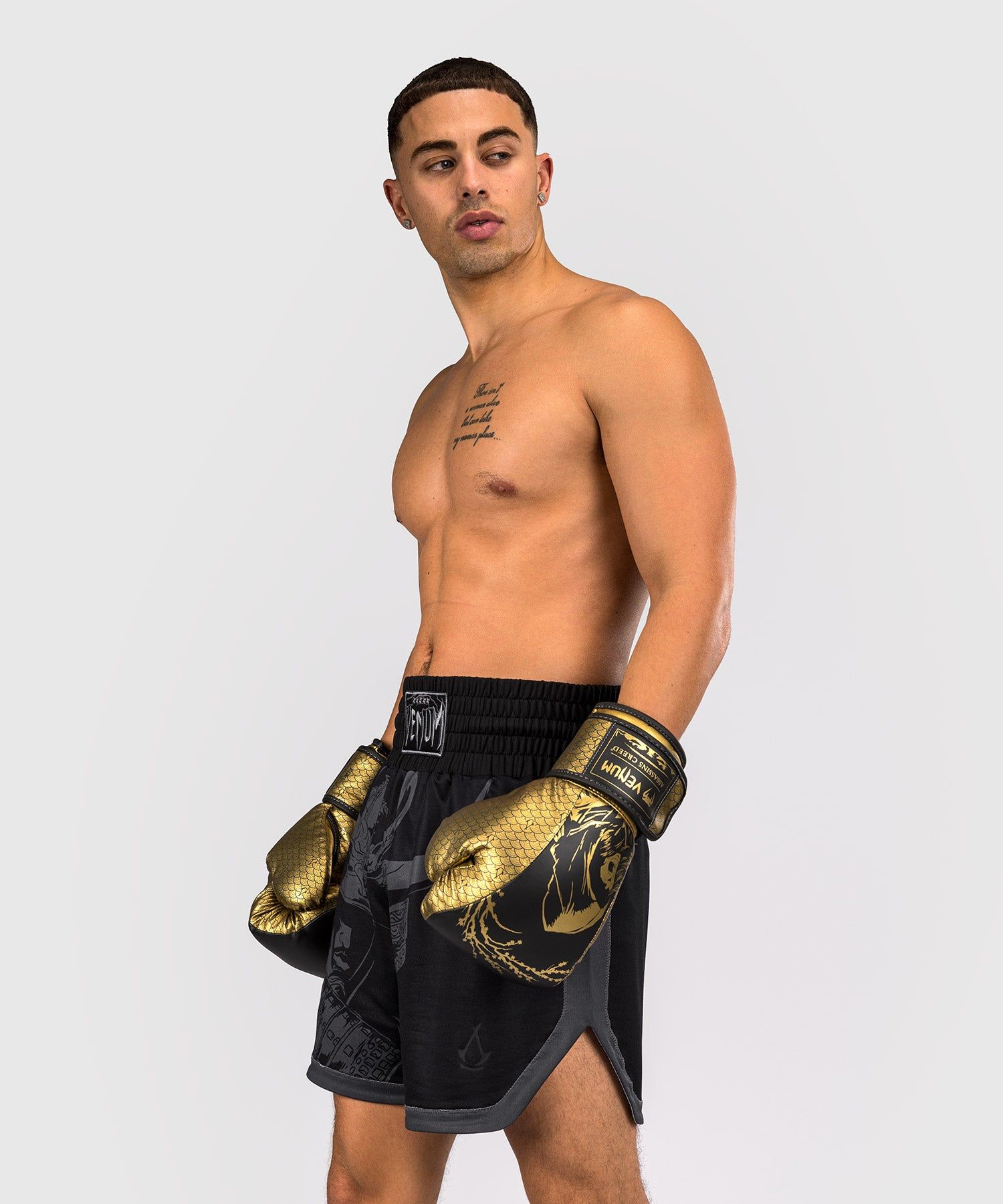Venum x 《刺客信条:影》联名款男士拳击短裤是一款专为拳击运动员和练习者设计的轻质短裤。其采用传统的宽腰带设计,确保稳固贴合,让你可以专注于在拳击场上的表现。同时,弹性面料和侧面开衩设计提供了全方位的活动自由度。 黑色短裤正面的精美渐变图案展现了武士弥助的威严形象。在训练中穿上这件衣服,仿佛能唤起弥助的力量和武术造诣。