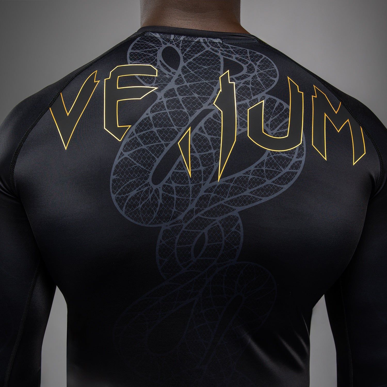 Venum Serpenti:以蛇类沉着而凌厉的力量加持你的每一次表现。这一高端系列涵盖全品类专业运动服饰与格斗运动装备。 Venum Serpenti男士长袖紧身衣专为缠斗、巴西柔术及综合格斗设计。其设计旨在防护擦伤、灼伤与刮伤,同时确保击打与地面缠斗中的活动自由。面料“第二层皮肤”般的压缩效果,为高强度训练提供支撑,并促进肌肉恢复。
