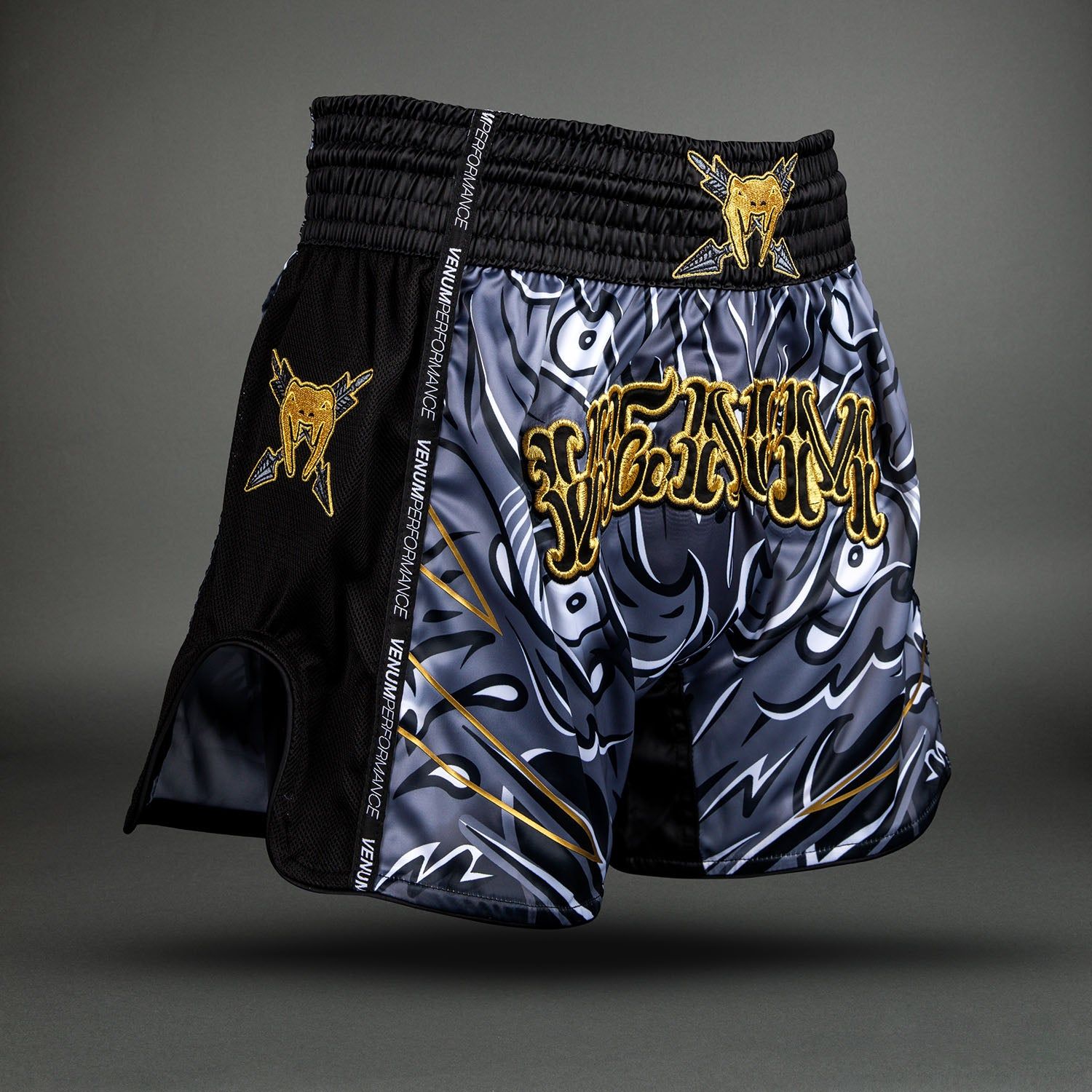 VENUM Wolf Atak 泰拳短裤采用轻量快干性能面料制成,赋予你自由活动空间。侧边开衩设计提升拳台动作幅度。传统宽腰带提供稳固支撑,让你专注于比赛表现。