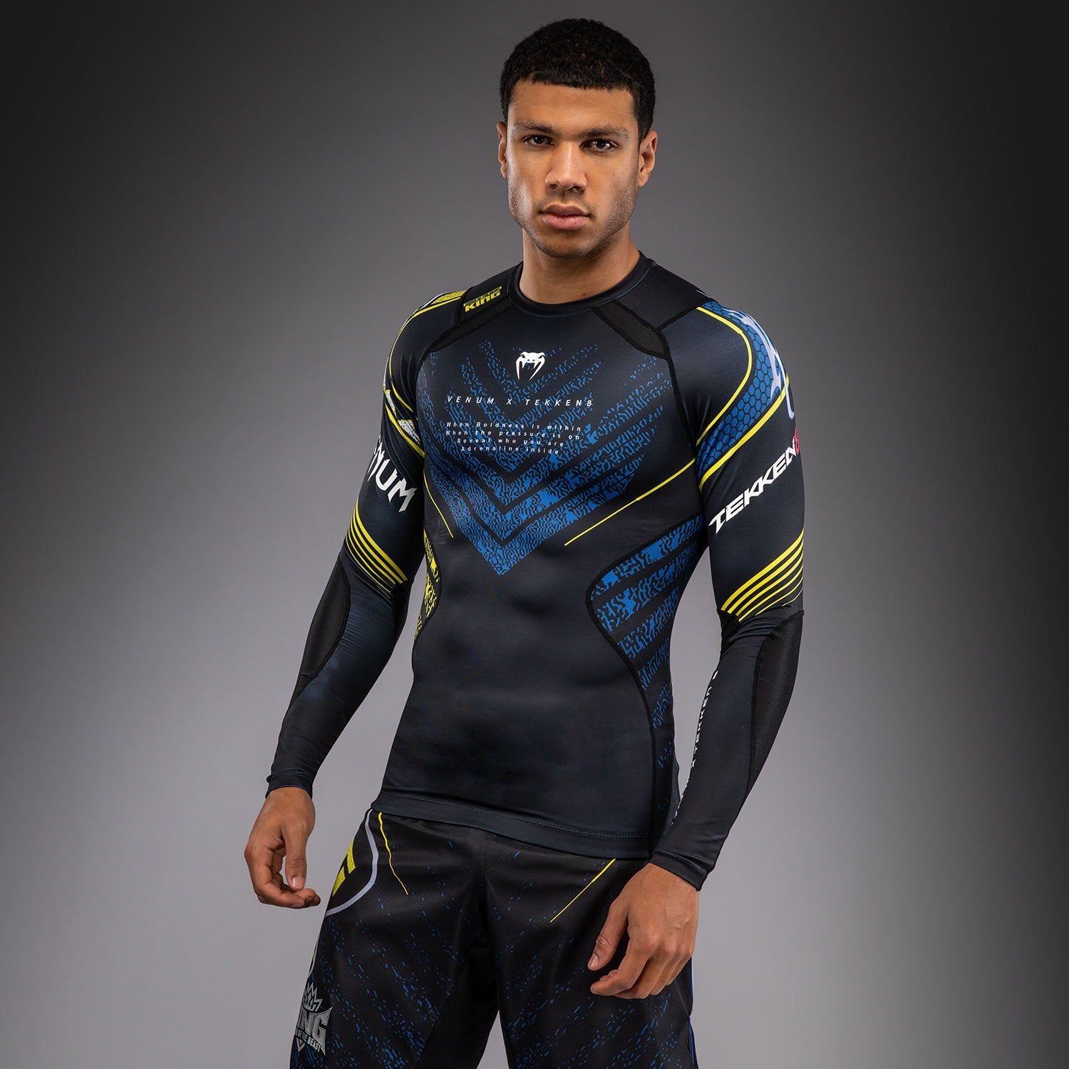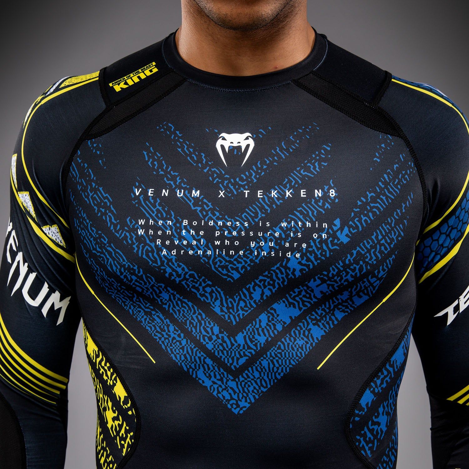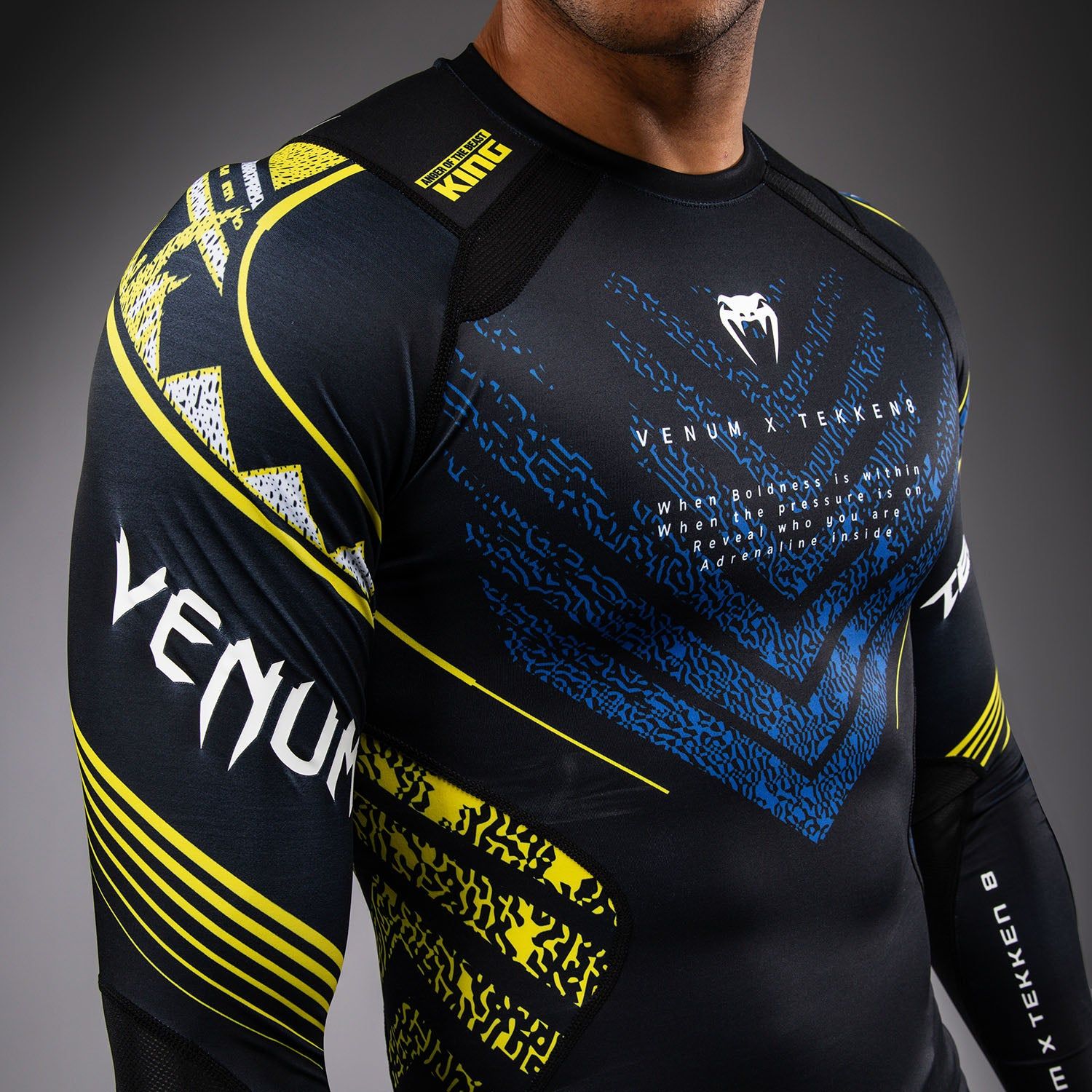 VENUM x TEKKEN 8 长袖紧身衣 - King 采用压缩设计,专为格斗、巴西柔术及综合格斗中的地面缠斗提供防擦伤保护。紧身剪裁增强肌肉支撑力,有助于加速恢复。网眼拼接设计实现快速排汗。其设计彰显了King职业摔角手的形象,呼应其标志性风格。