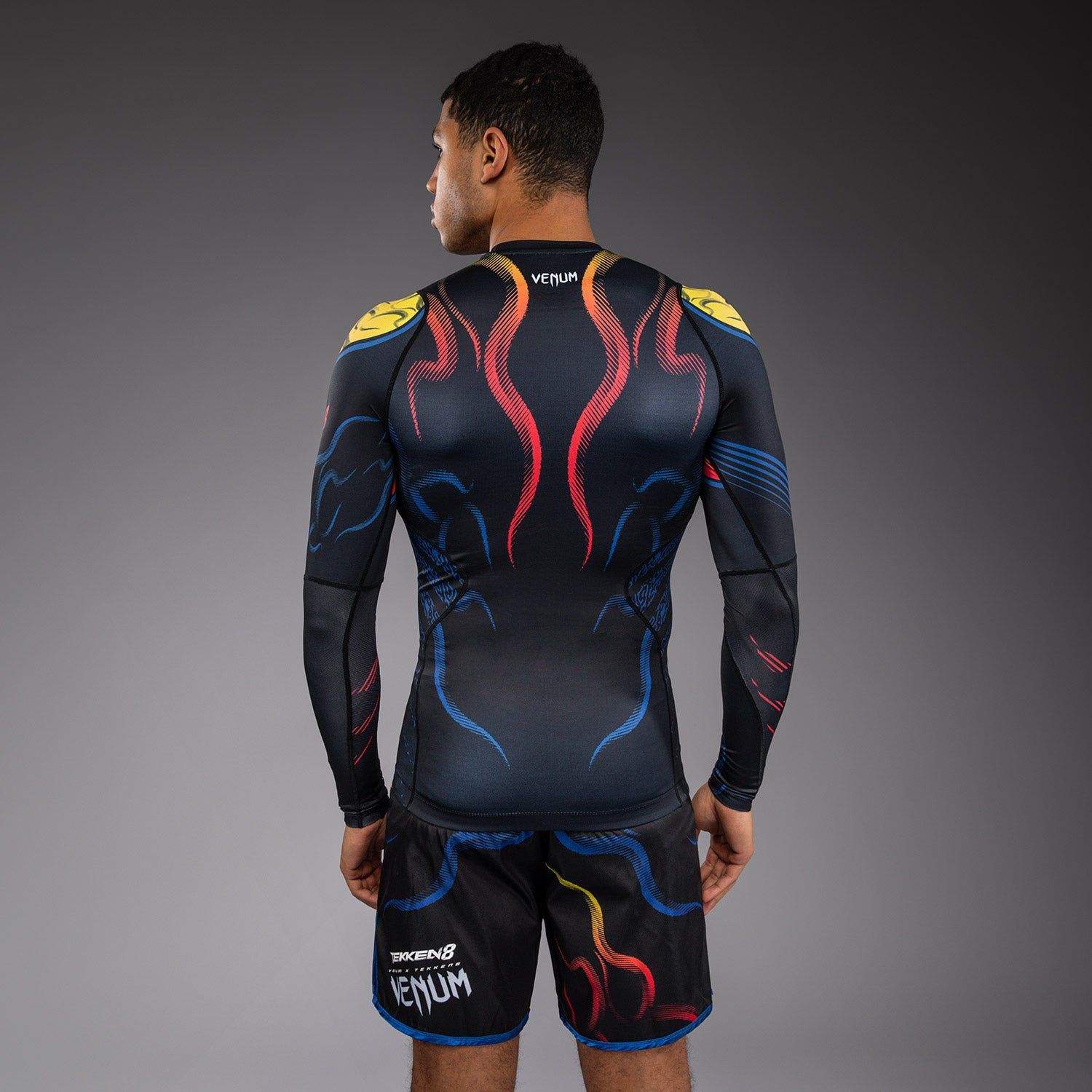 VENUM x TEKKEN 8 长袖紧身衣 - Yoshimitsu采用压缩设计,专为格斗、巴西柔术及综合格斗中的地面缠斗提供防擦伤保护。紧身剪裁增强肌肉支撑力,有助于加速恢复。网眼拼接设计实现快速排汗。其设计彰显了Yoshimitsu的机械忍者美学。