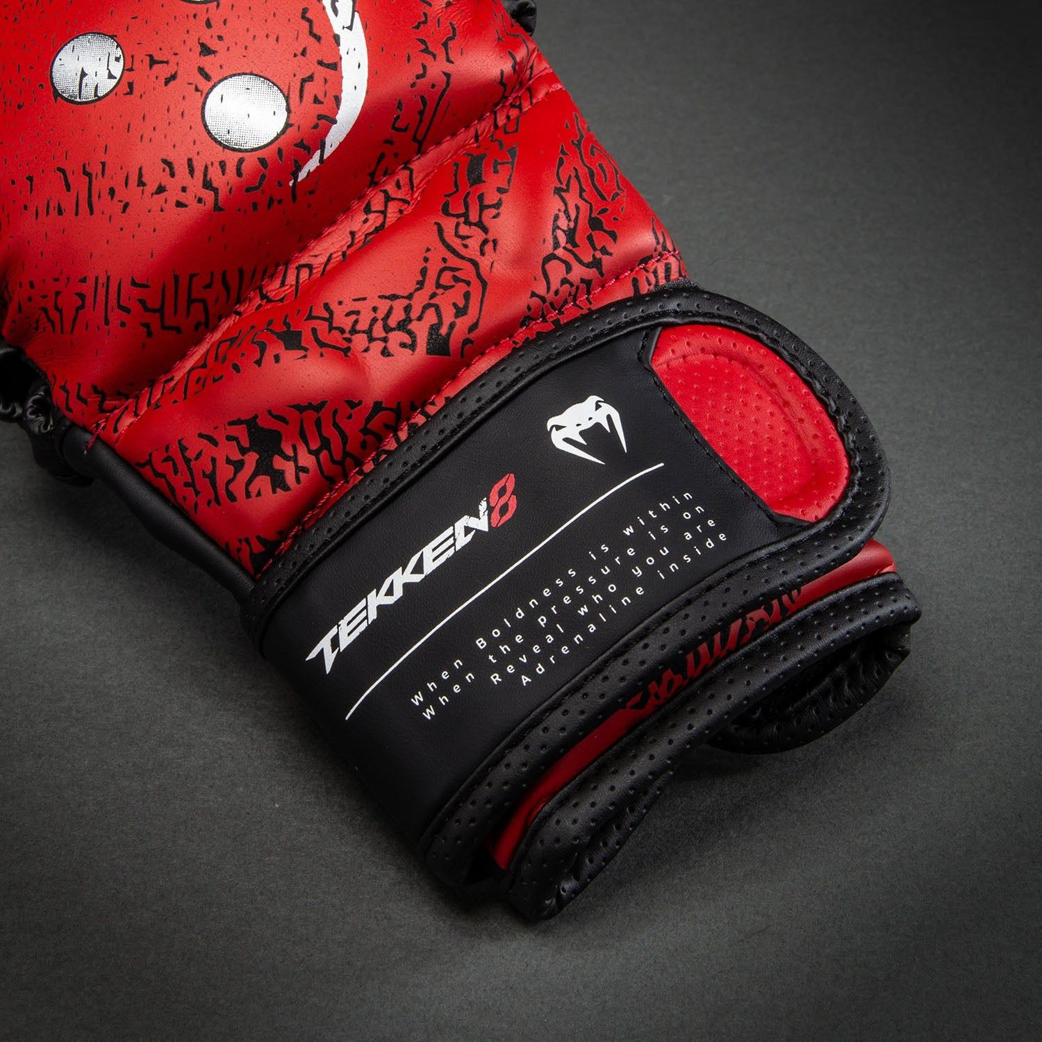 VENUM x TEKKEN 8 MMA综合格斗手套 - Kazuya采用标志性的红黑配色。手套上的裂纹图案呼应了Kazuya激活恶魔基因时身体浮现的印记,醒目的白色圆点则复刻了Kazuya额头纹章的轮廓。