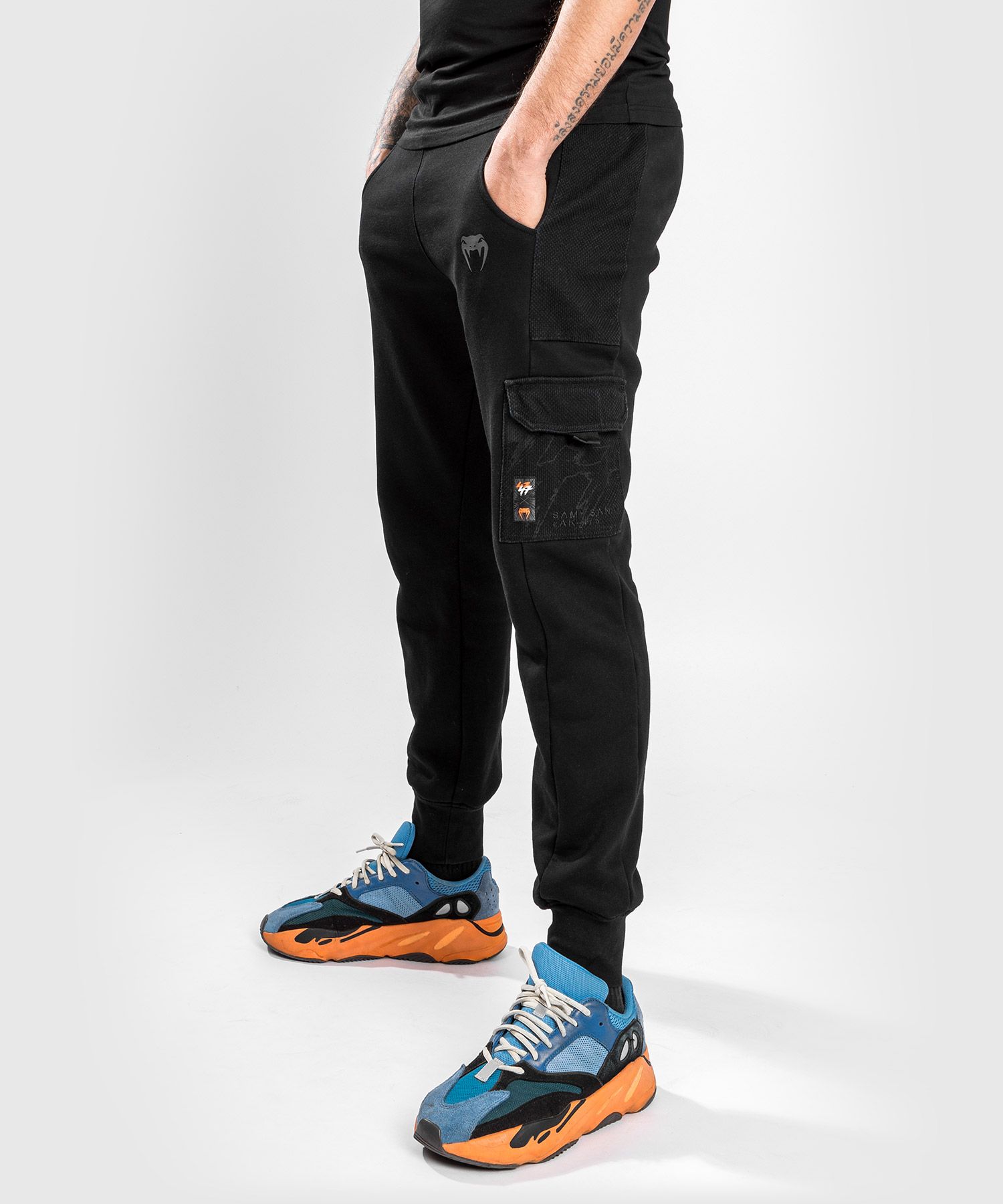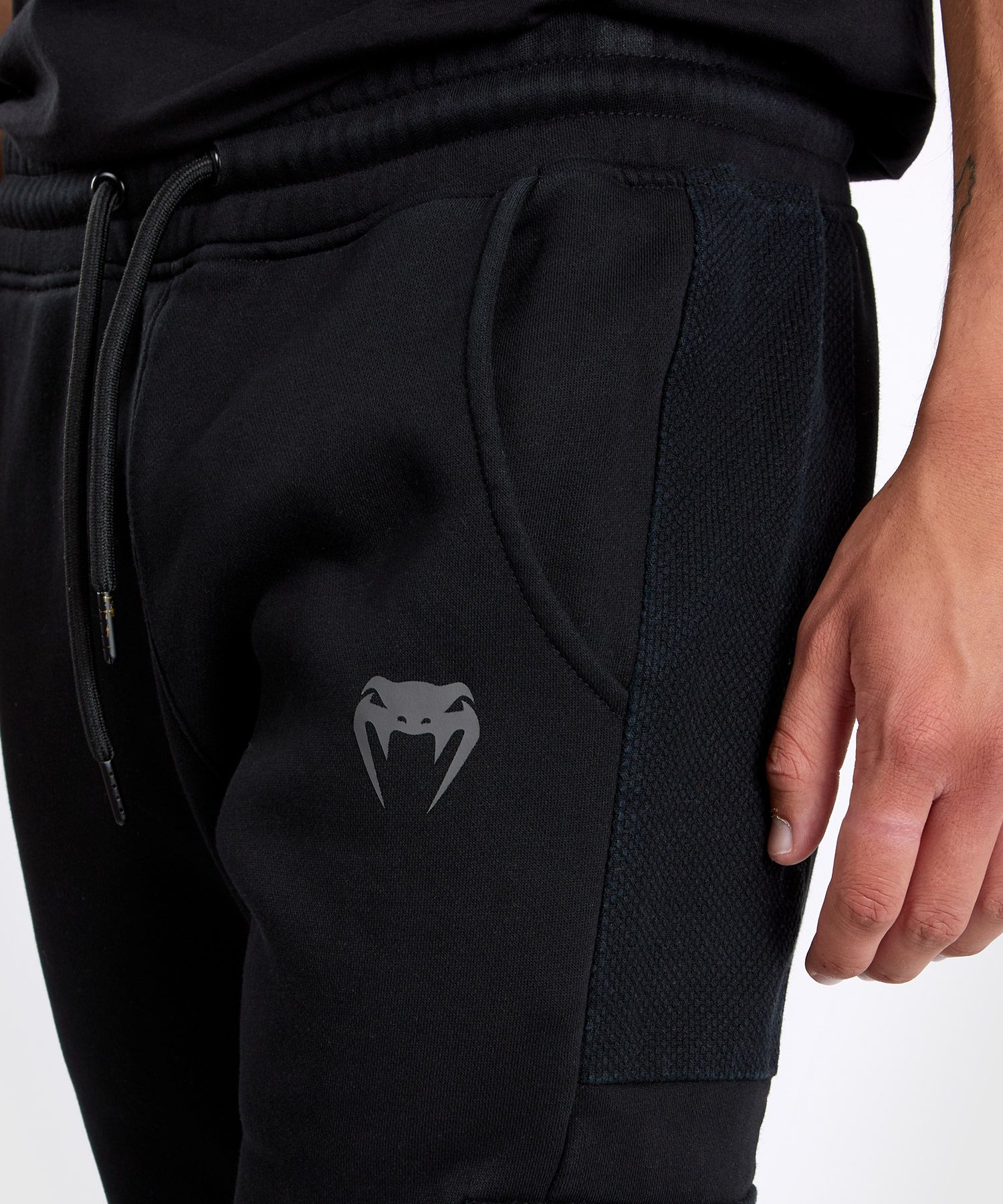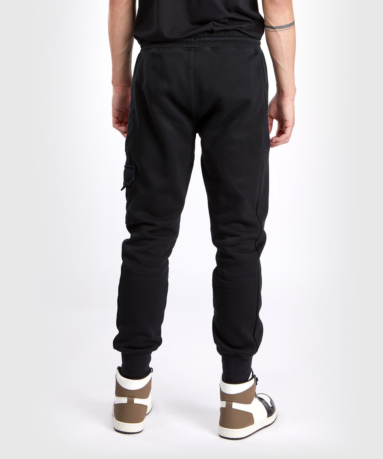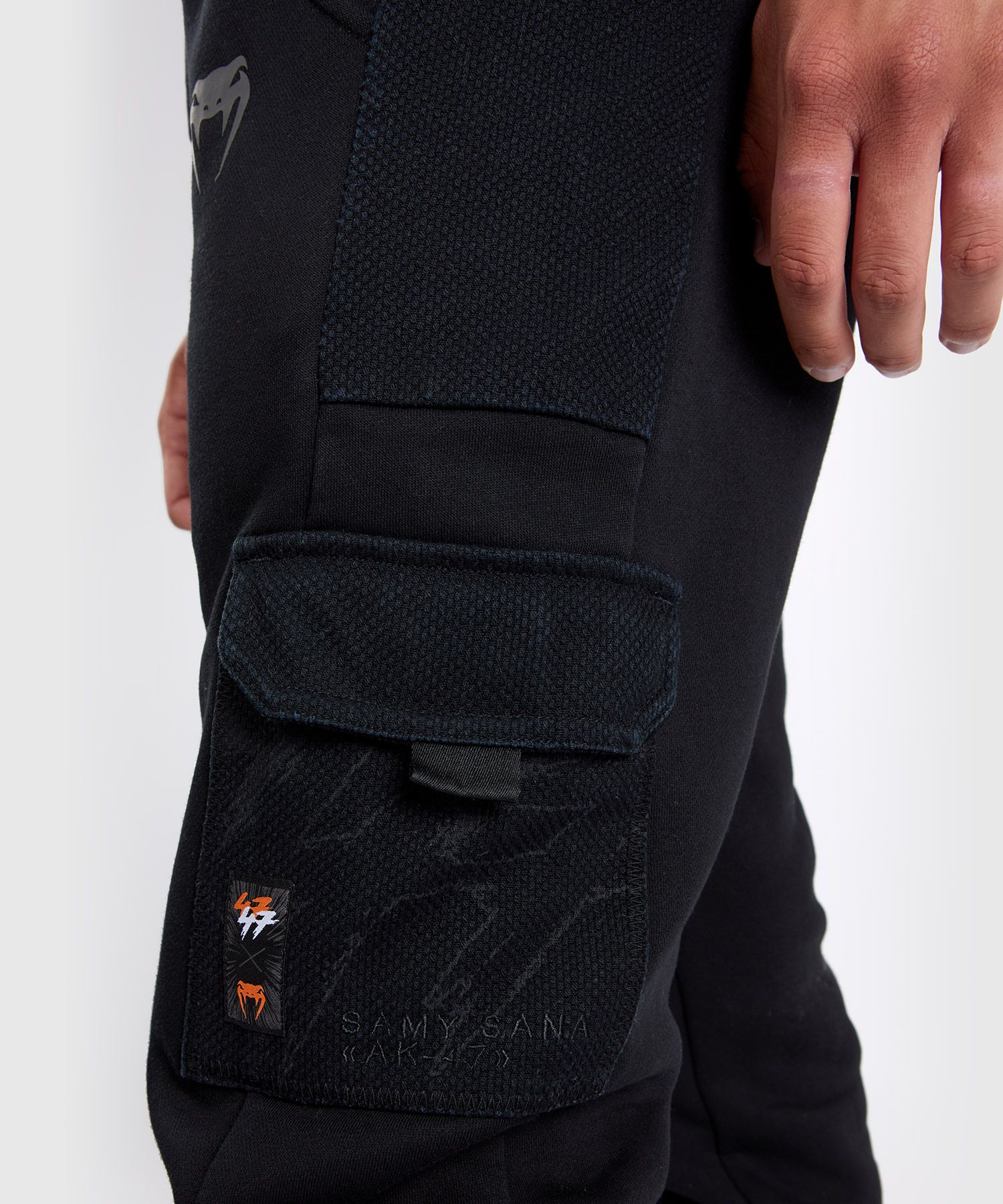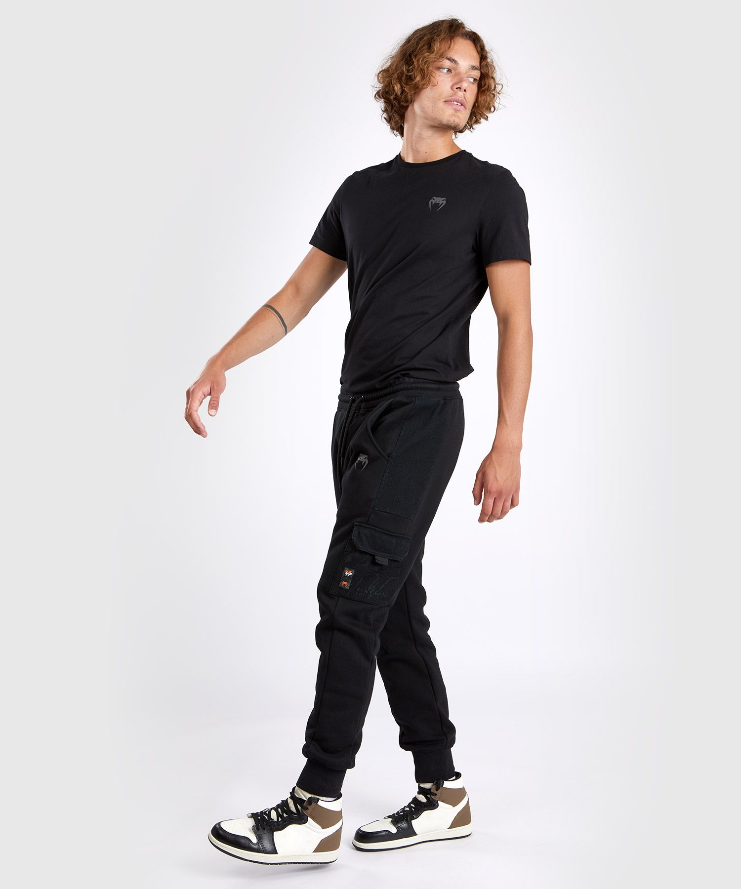 VENUM S47 卫裤是一款高品质黑色休闲裤,臀部印有灰色VENUM徽标,大腿处印有 VENUM x S47 标志。左侧大腿处有翻口袋设计,口袋旁边有 VENUM x S47 徽标。腰部的抽绳设计确保了这款休闲裤的合身性。