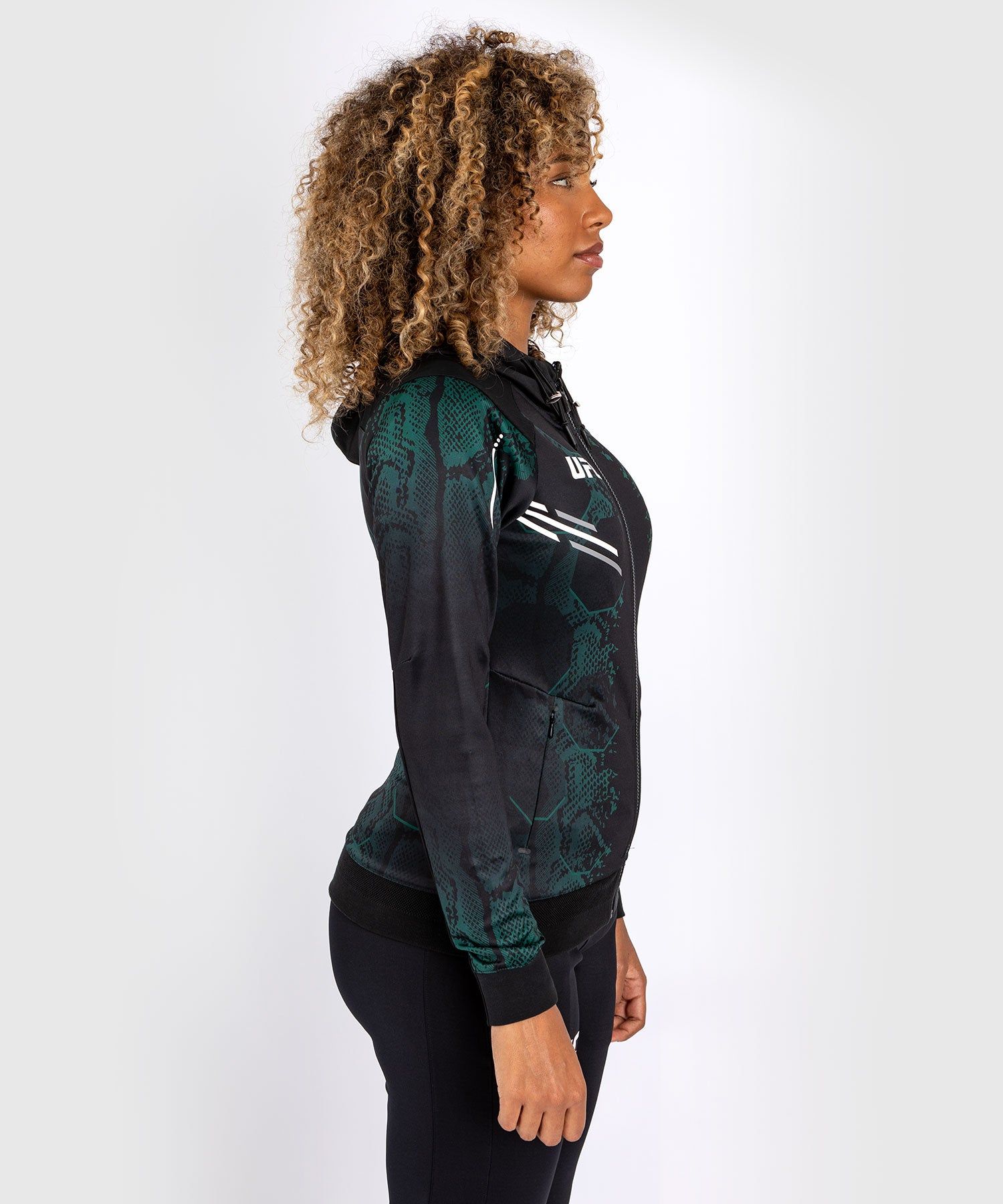 可将这款女士出场外套与同一系列UFC Adrenaline | VENUM Authentic格斗之夜系列-绿宝石版T恤搭配穿着。