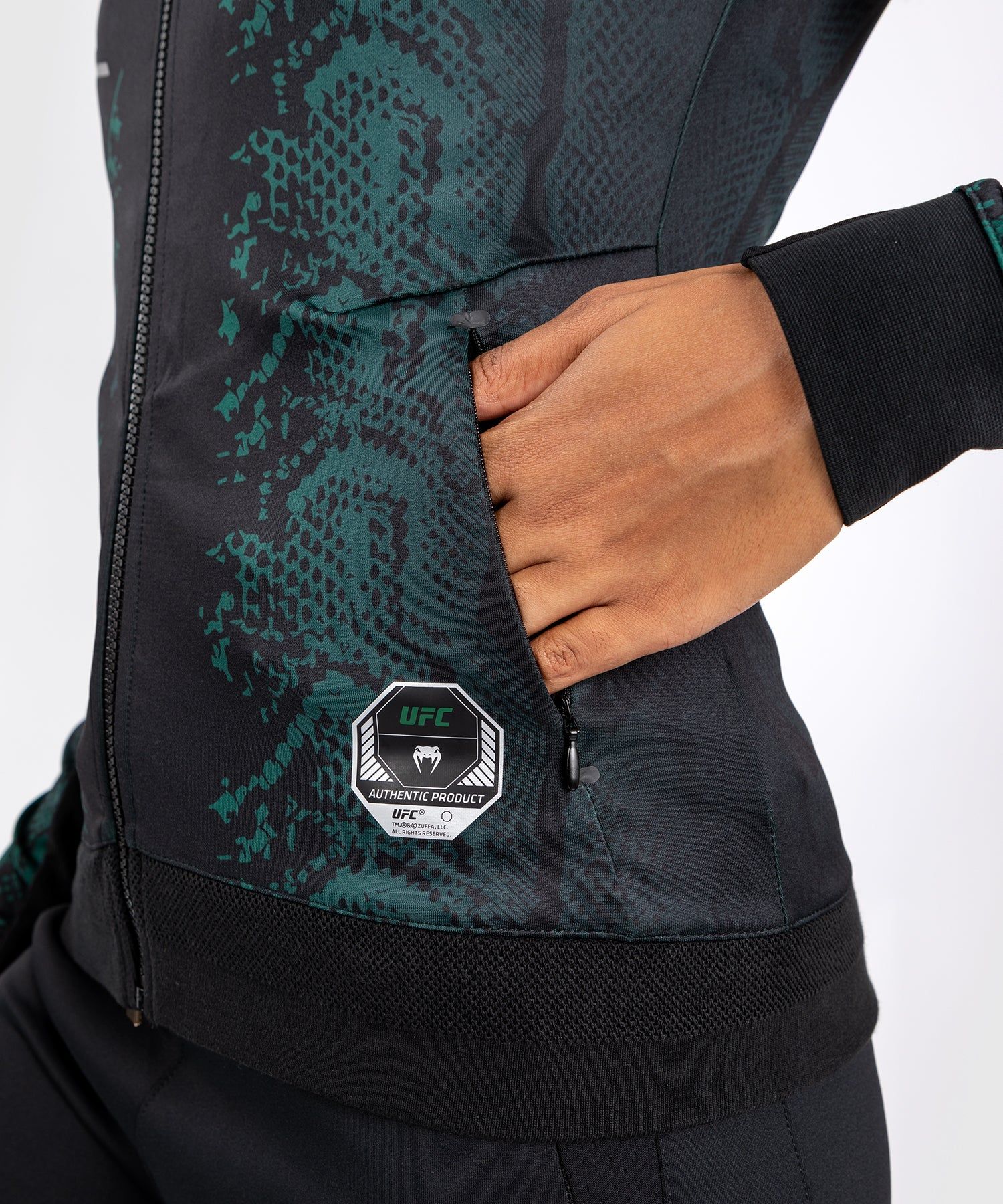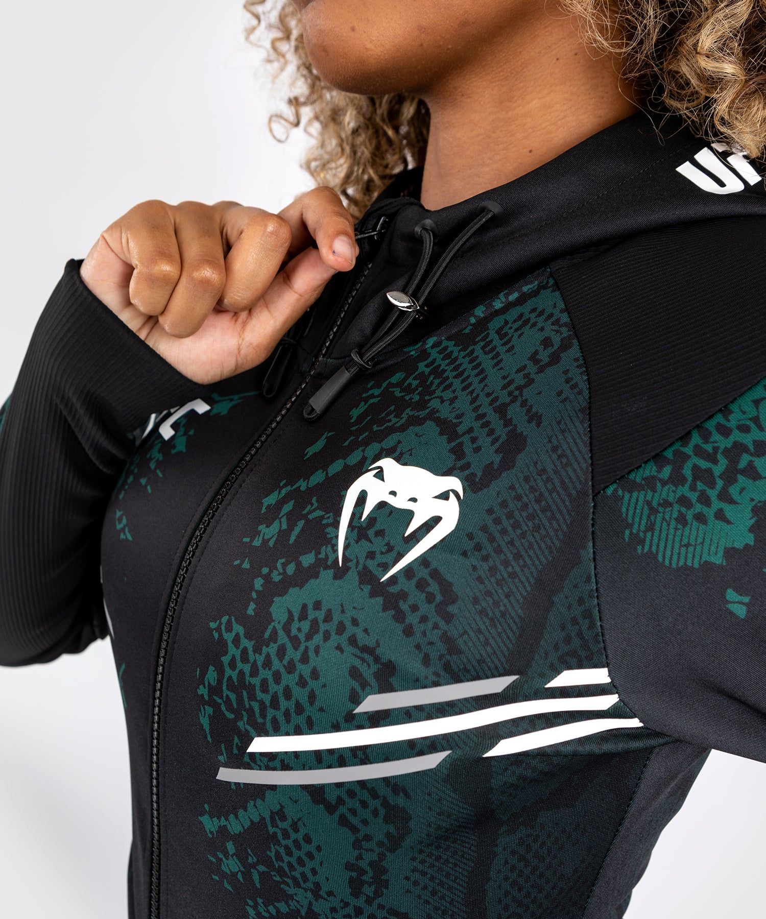 UFC Adrenaline | VENUM Authentic格斗之夜系列-绿宝石版女士外套两侧附带拉链口袋,还有一个带可调节抽绳连帽。腕部和手臂内侧采用优质弹力面料,让运动员无需卸下手套即可脱下外套。