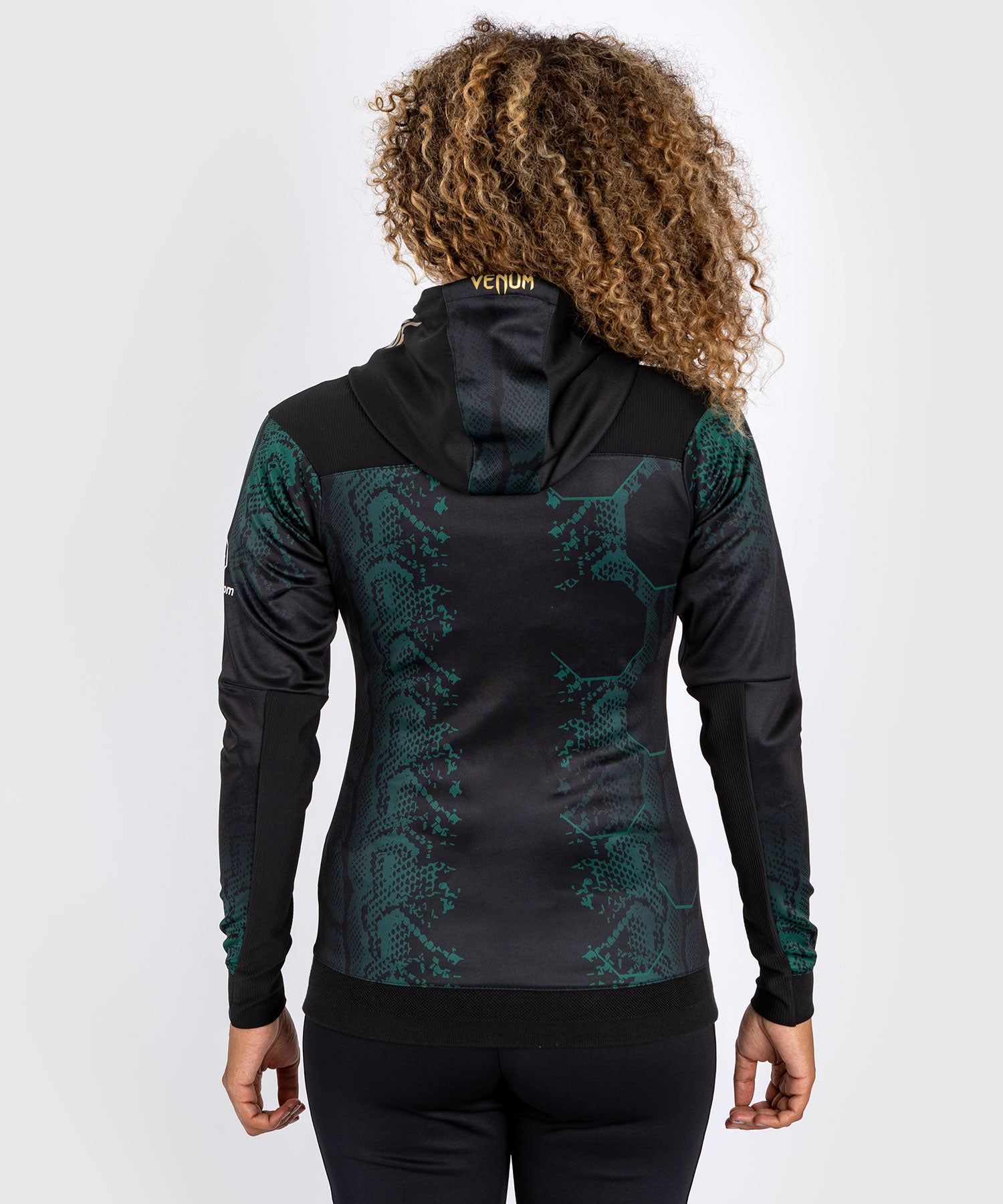 UFC Adrenaline | VENUM Authentic格斗之夜系列-绿宝石版女士外套两侧附带拉链口袋,还有一个带可调节抽绳连帽。腕部和手臂内侧采用优质弹力面料,让运动员无需卸下手套即可脱下外套。