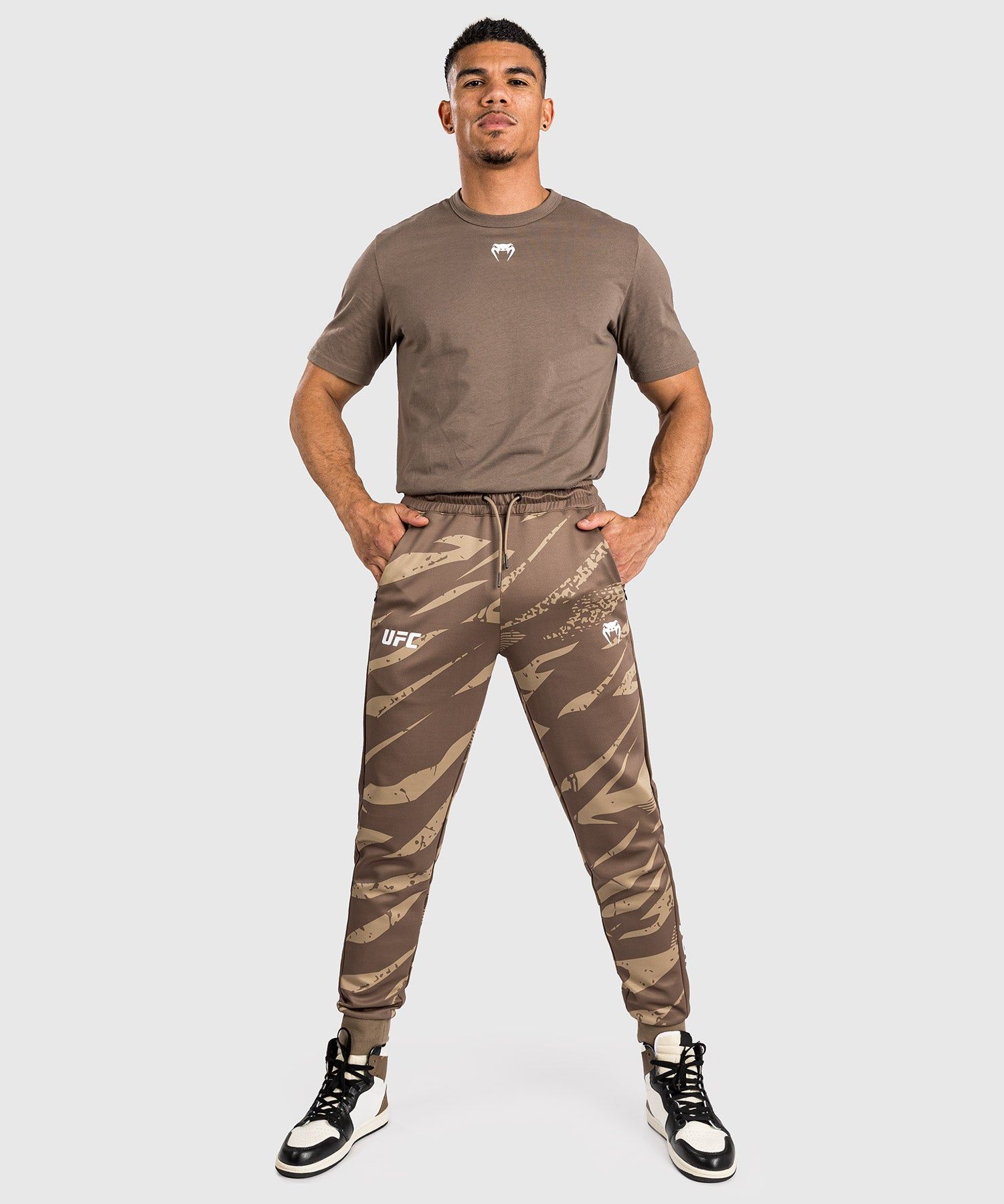 UFC Adrenaline by Venum 格斗周男士运动长裤采用拉链侧袋和抽绳腰带,穿着舒适。这款卫裤设计轻盈,弹力恰到好处,可满足运动员的运动需求。其大胆的迷彩印花,配以古铜色的Venum和UFC徽标,灵感来自于步入八角笼的运动员,随时准备出击和反击。