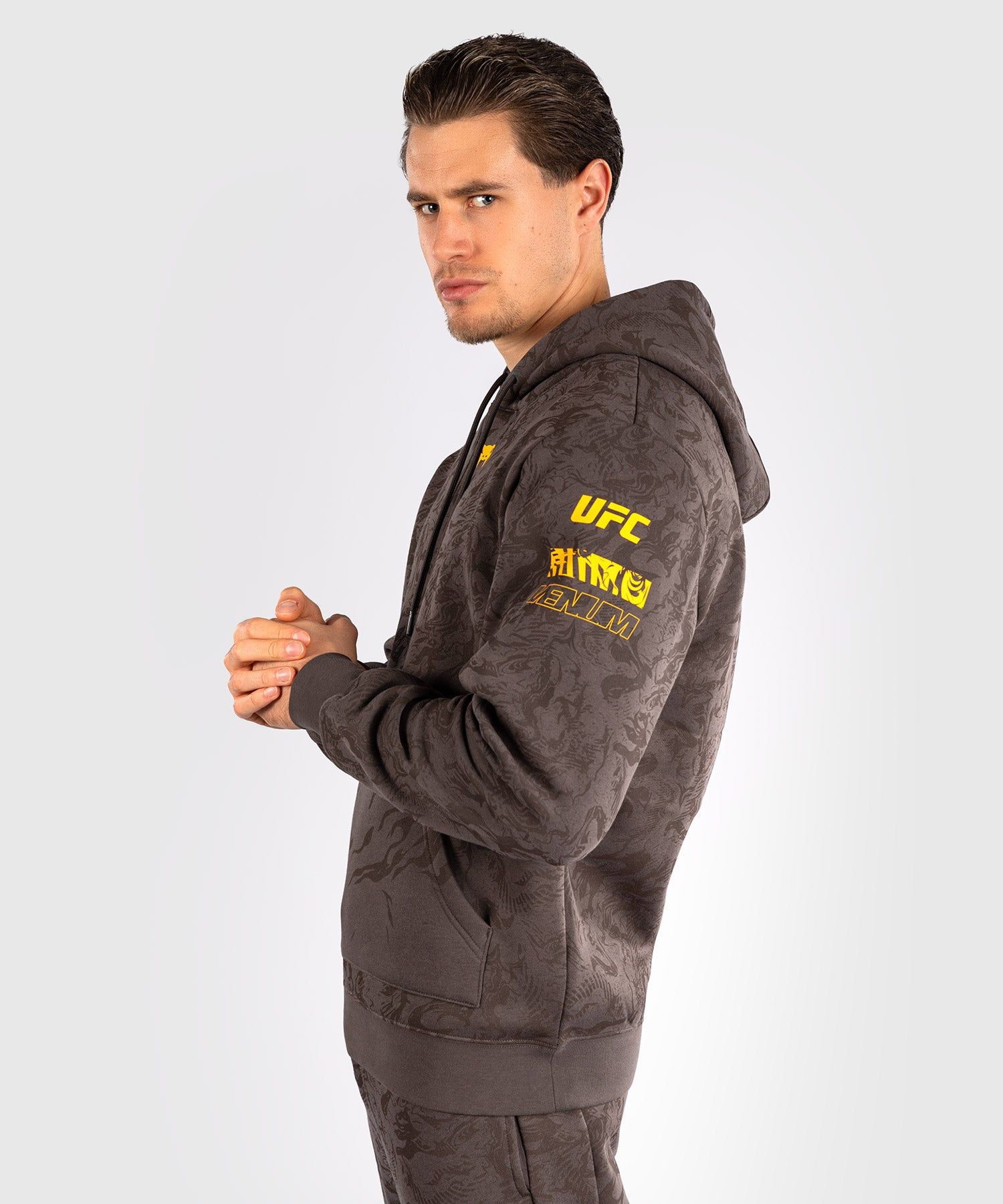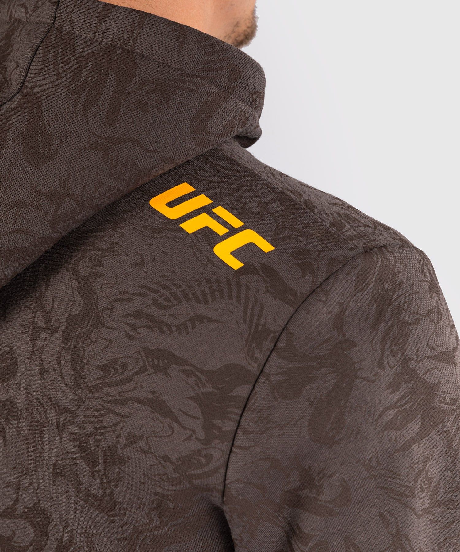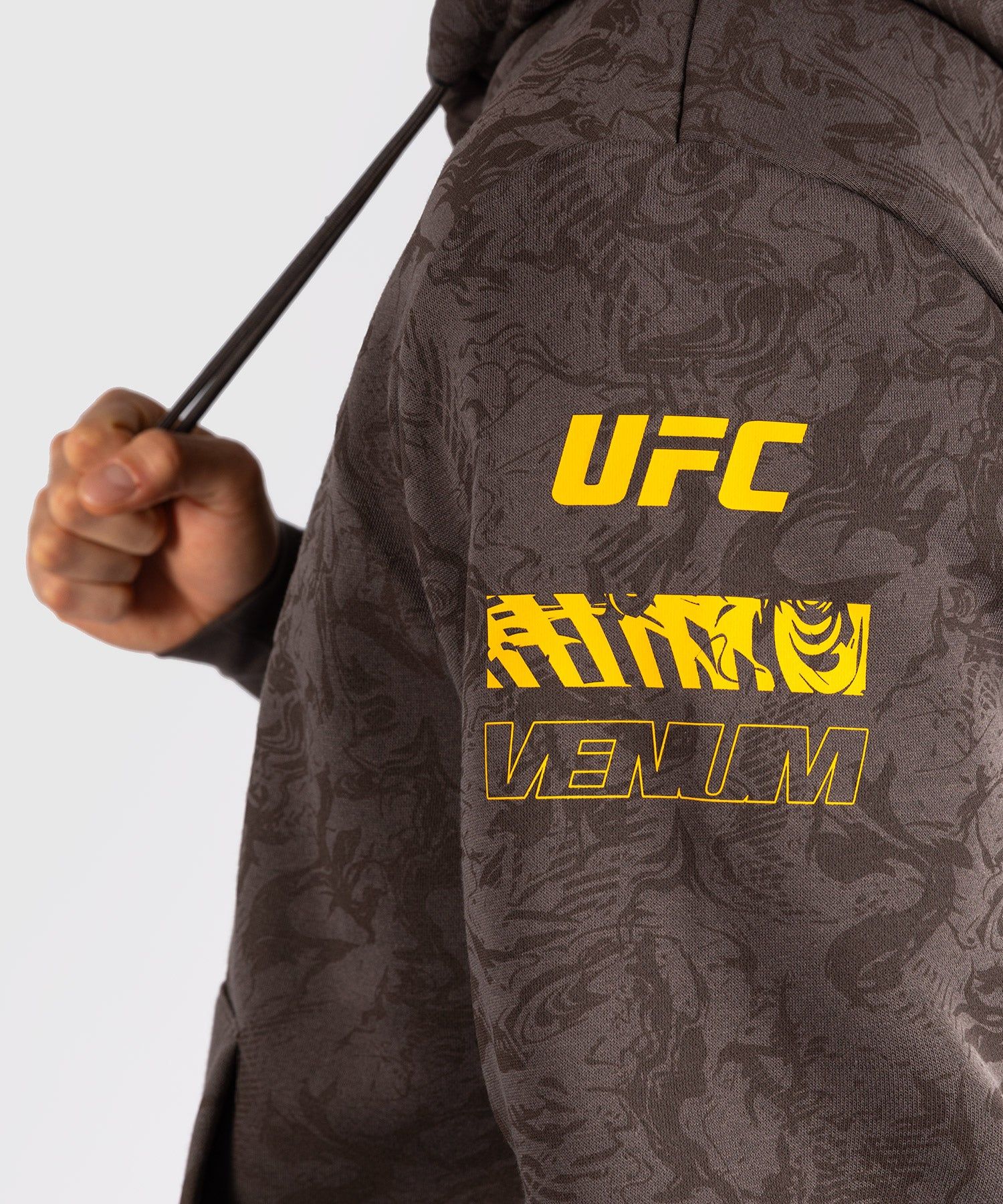 UFC Fusion | VENUM 格斗周男士套头卫衣的胸前、左臂和右肩后部印有鲜明的印花Logo。袋鼠式前袋和抽绳兜帽也为这款连帽衫增加了些许设计感。