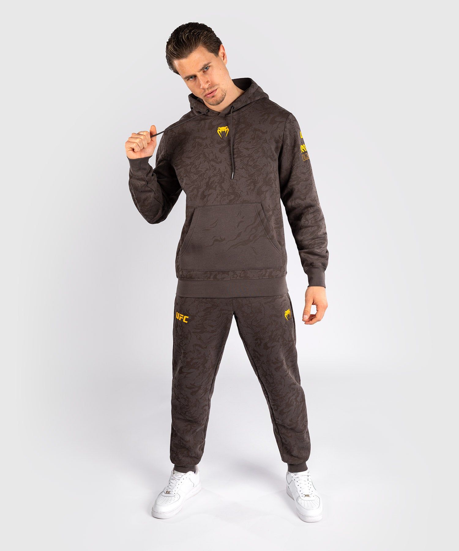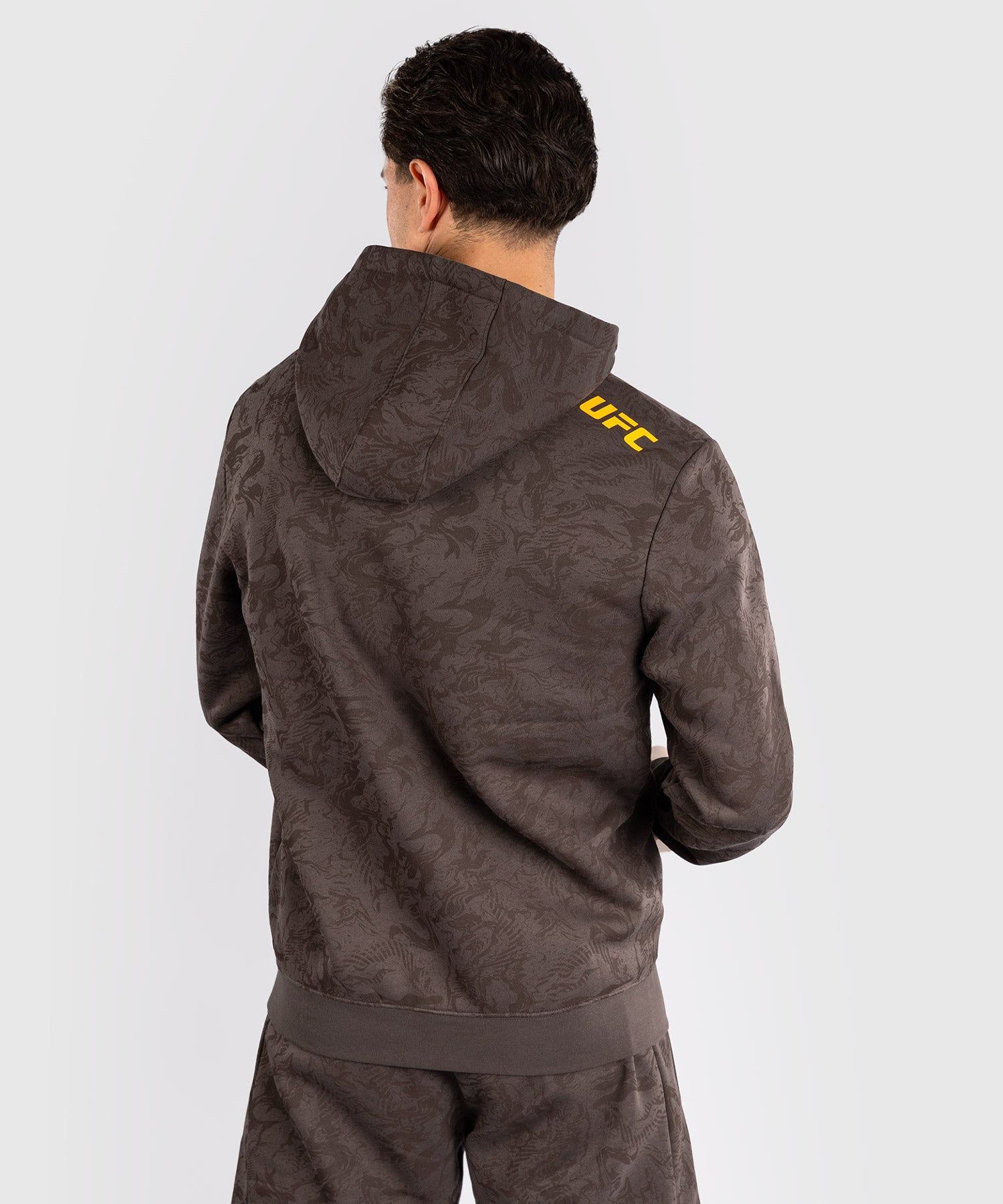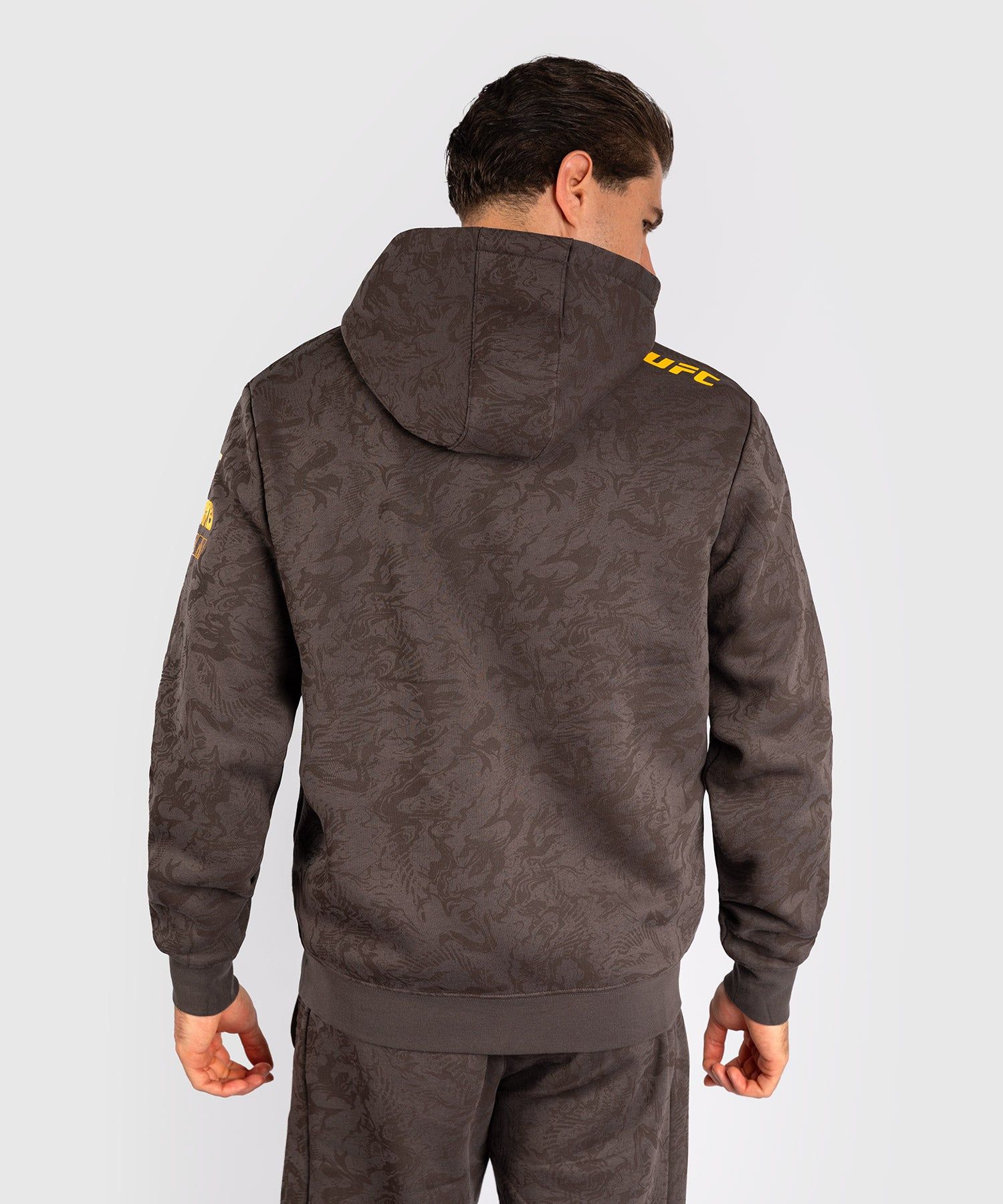 UFC Fusion | VENUM 格斗周男士套头卫衣的胸前、左臂和右肩后部印有鲜明的印花Logo。袋鼠式前袋和抽绳兜帽也为这款连帽衫增加了些许设计感。