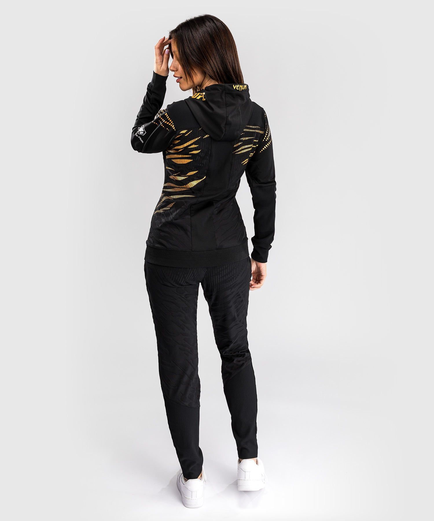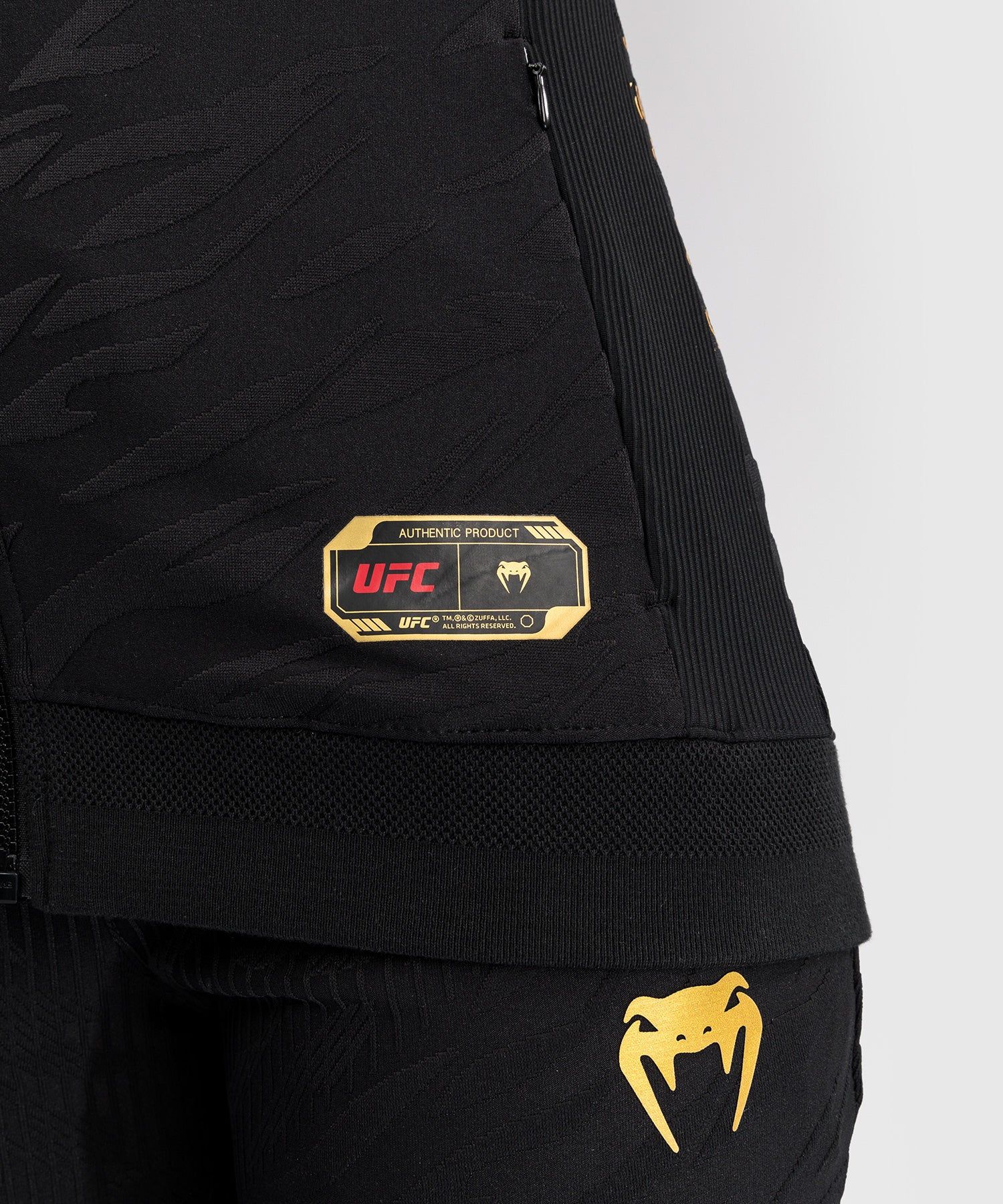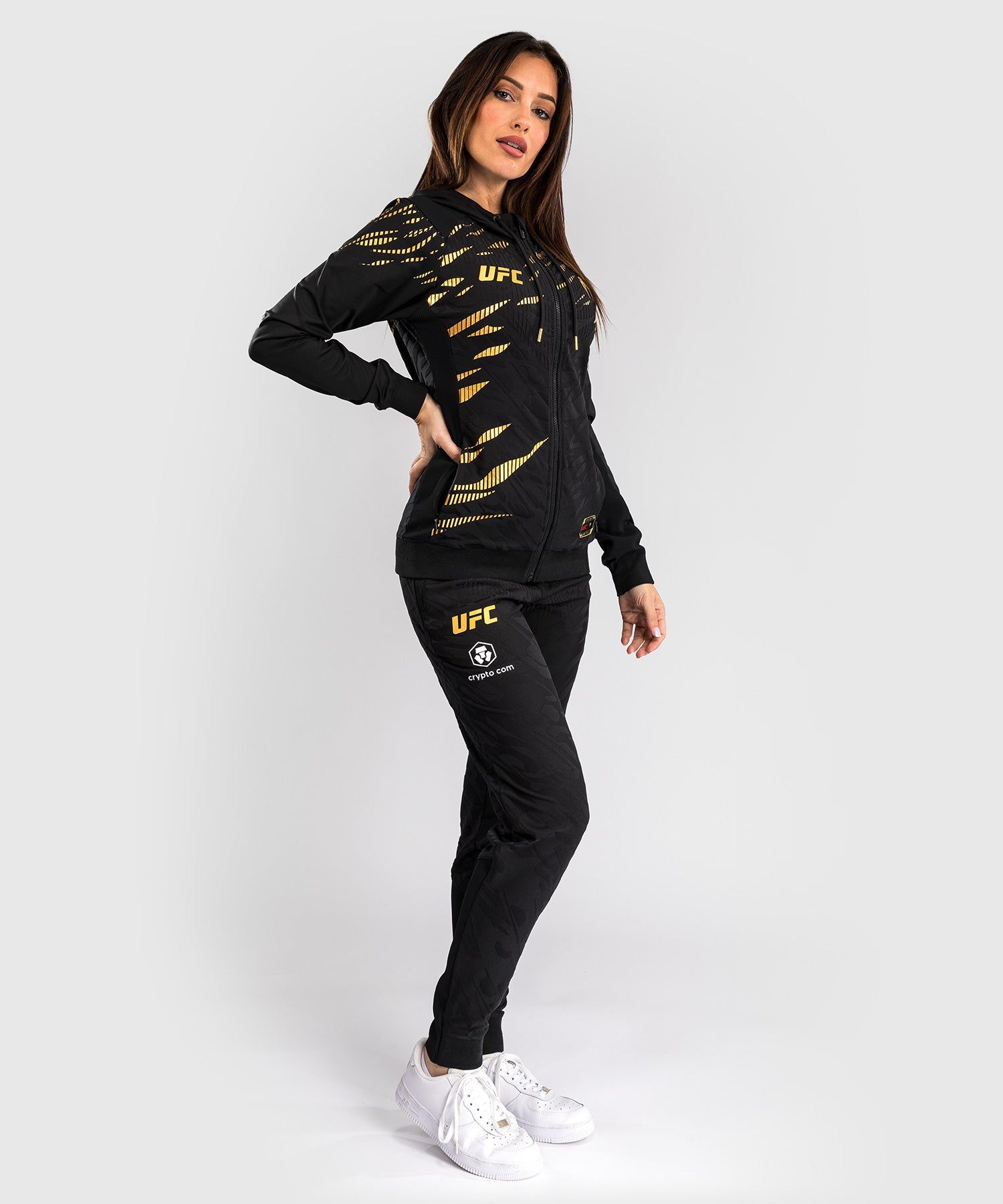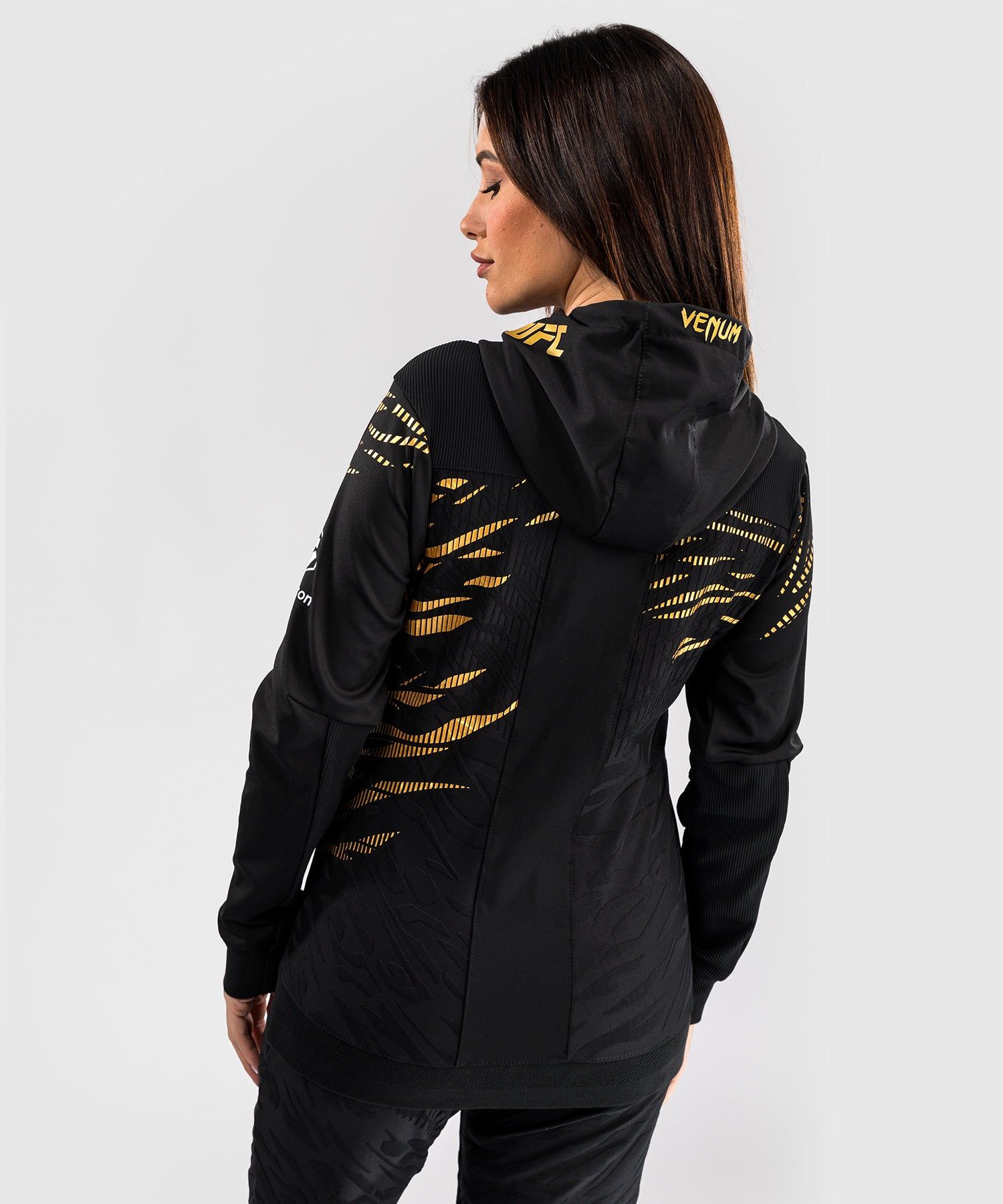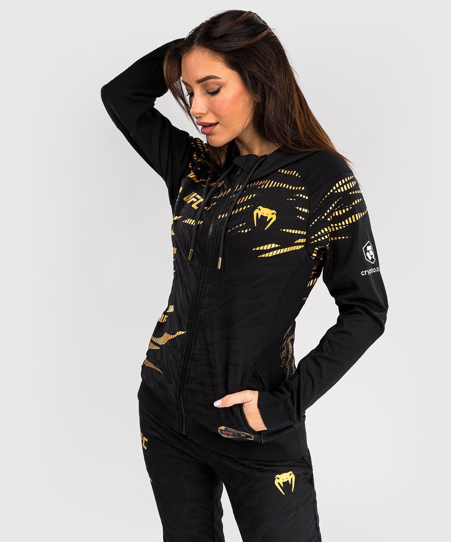 UFC Fusion | VENUM 格斗之夜女士出场外套有两个拉链口袋,以及带有可调节抽绳的网眼内衬兜帽。腕部和手臂内侧采用优质弹力面料,让运动员无需解开手套即可脱下连帽衫,其中黑金配色专为UFC冠军及粉丝而准备。