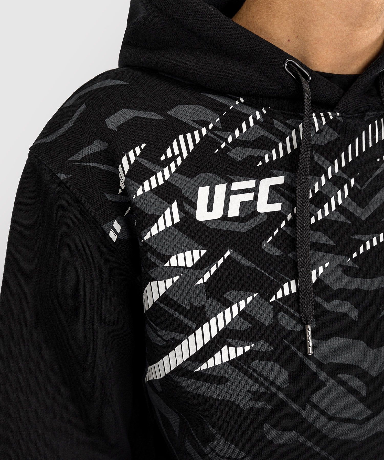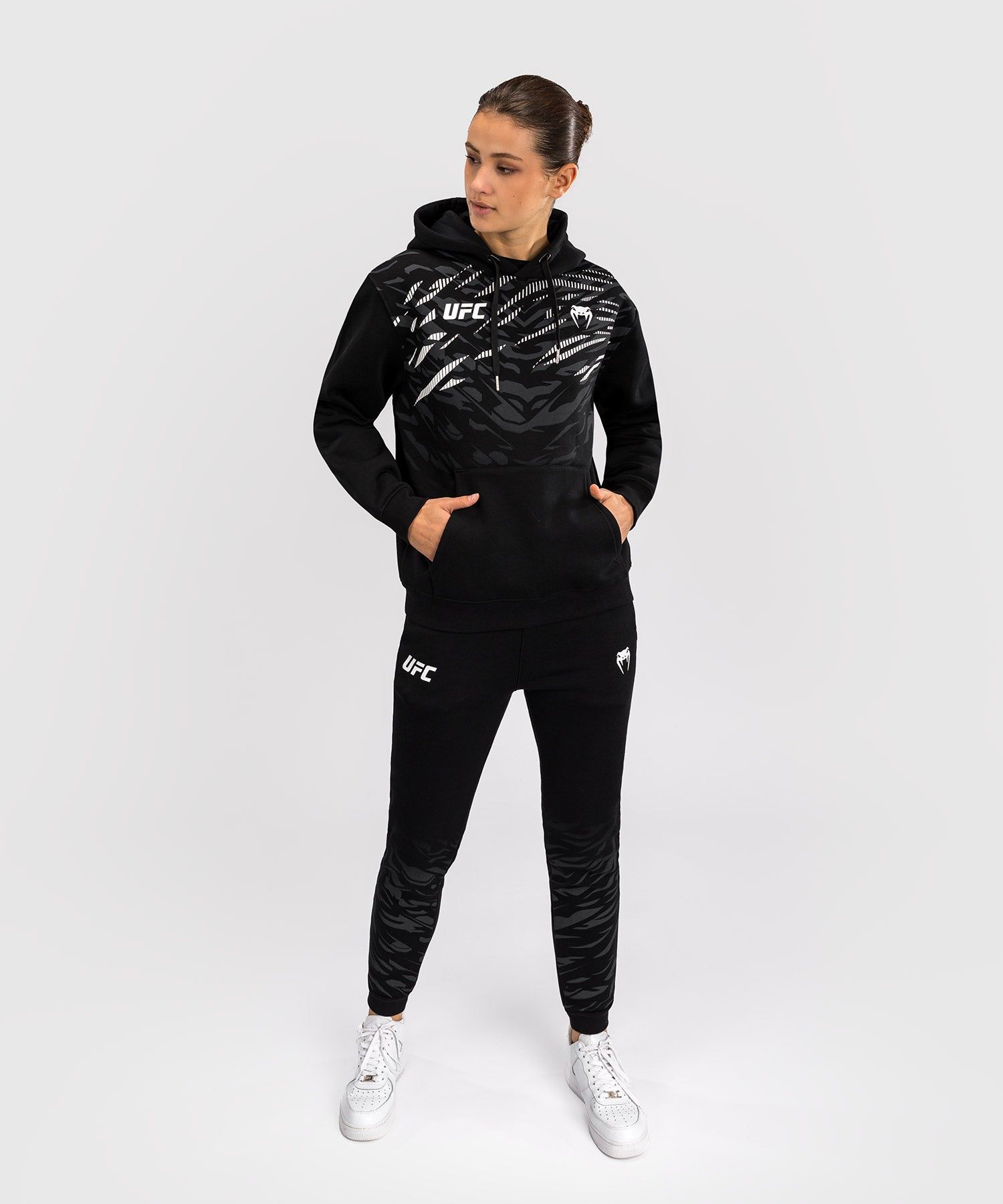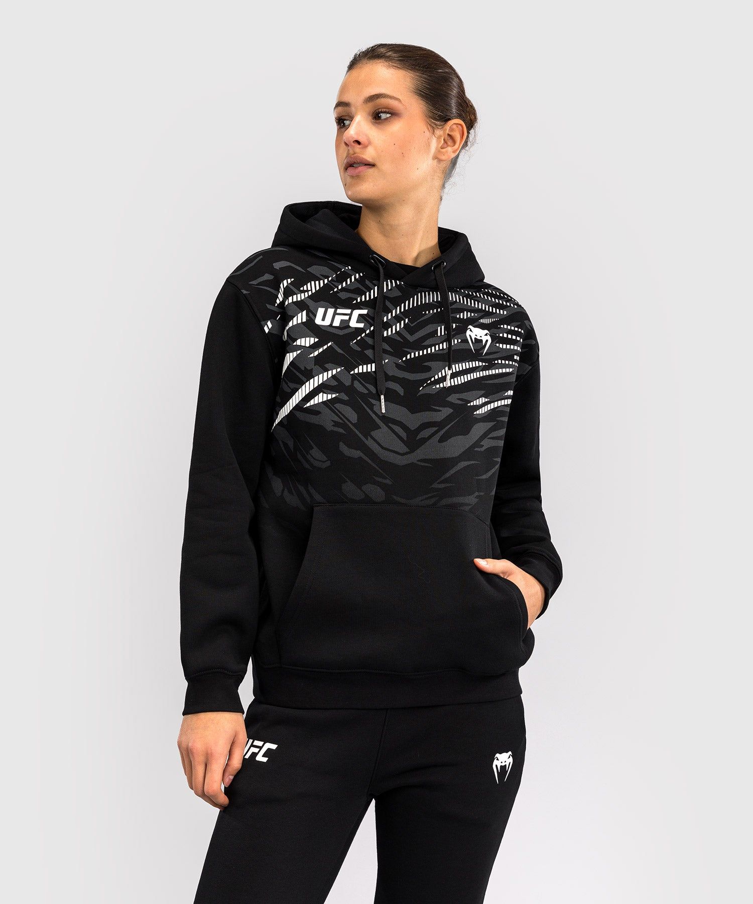 UFC Fusion | VENUM经典复刻系列女士卫衣采用袋鼠式前袋和抽绳兜帽,有两种颜色可供选择,其中黑金配色专为UFC冠军及粉丝而准备。