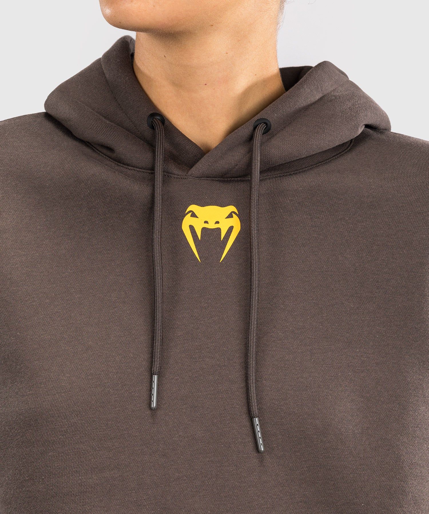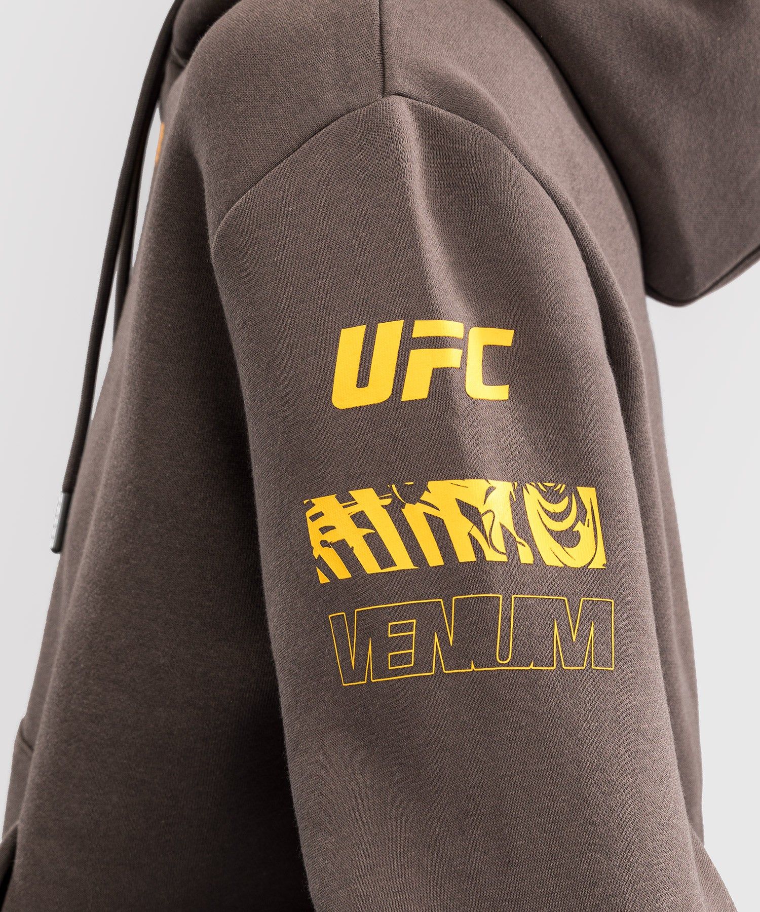 UFC Fusion | VENUM 格斗周女士卫衣的胸前、左臂和右肩后部印有鲜明的印花Logo。袋鼠式前袋和抽绳兜帽也为这款连帽衫增加了些许设计感。