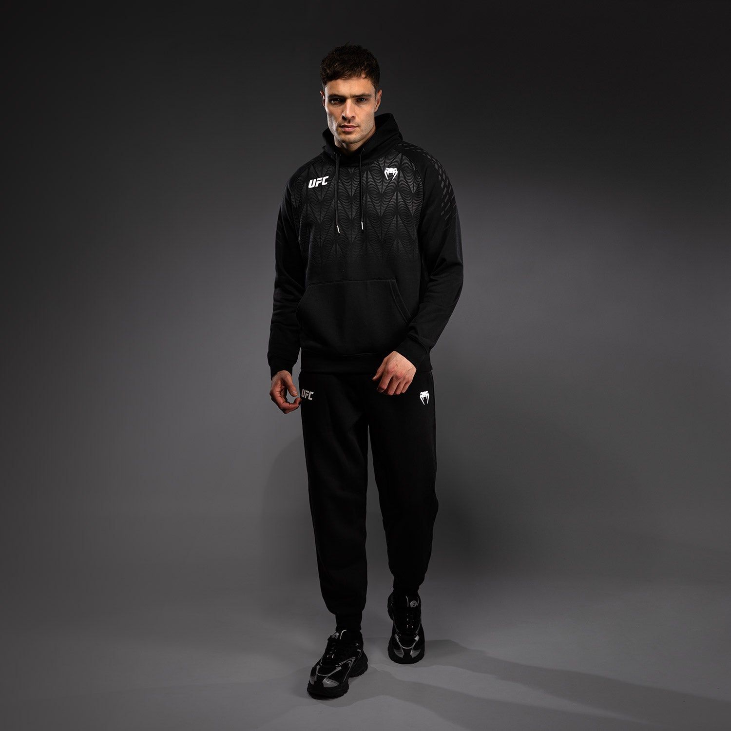 这款连帽卫衣采用袋鼠式前袋设计,配有抽绳连帽。VENUM与UFC品牌标识点缀于胸前及帽檐处。