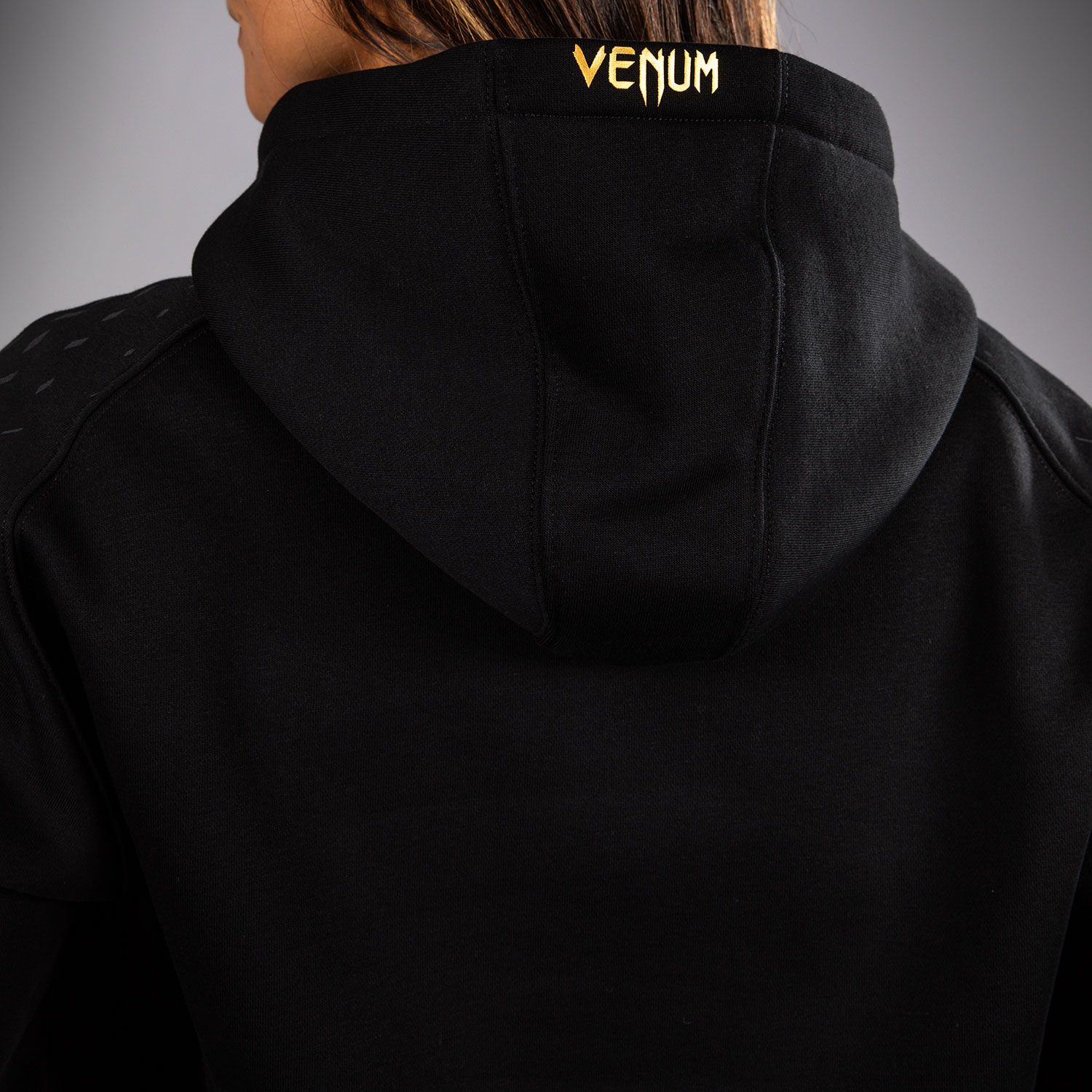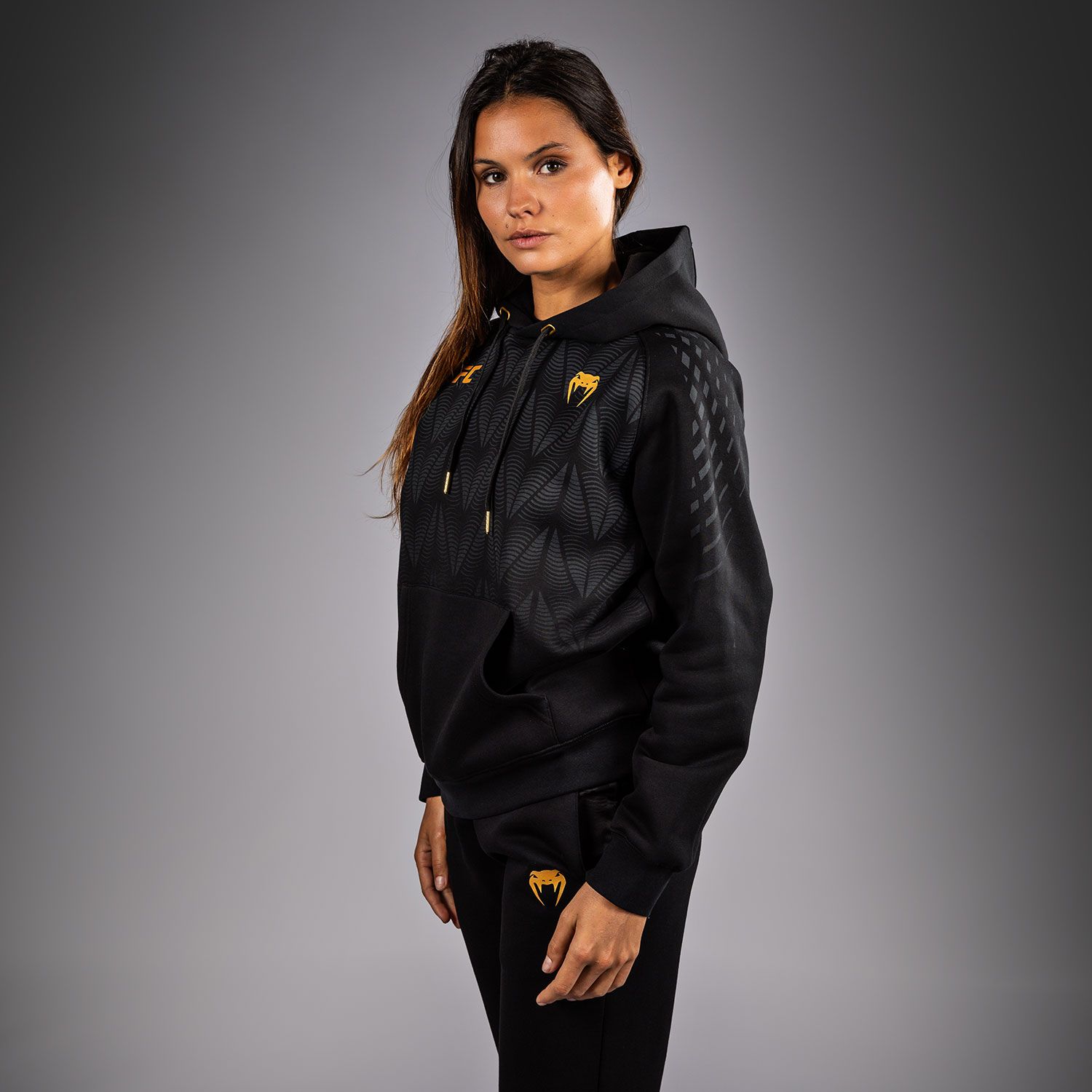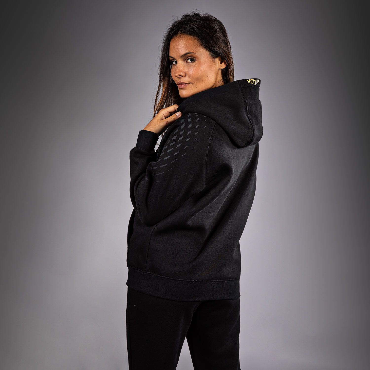 UFC Zenith 经典复刻 女士拉链连帽外套采用开合式侧袋设计,配有抽绳连帽。VENUM 与 UFC品牌标识点缀于胸前及帽檐处。