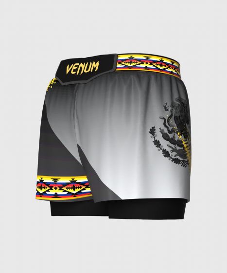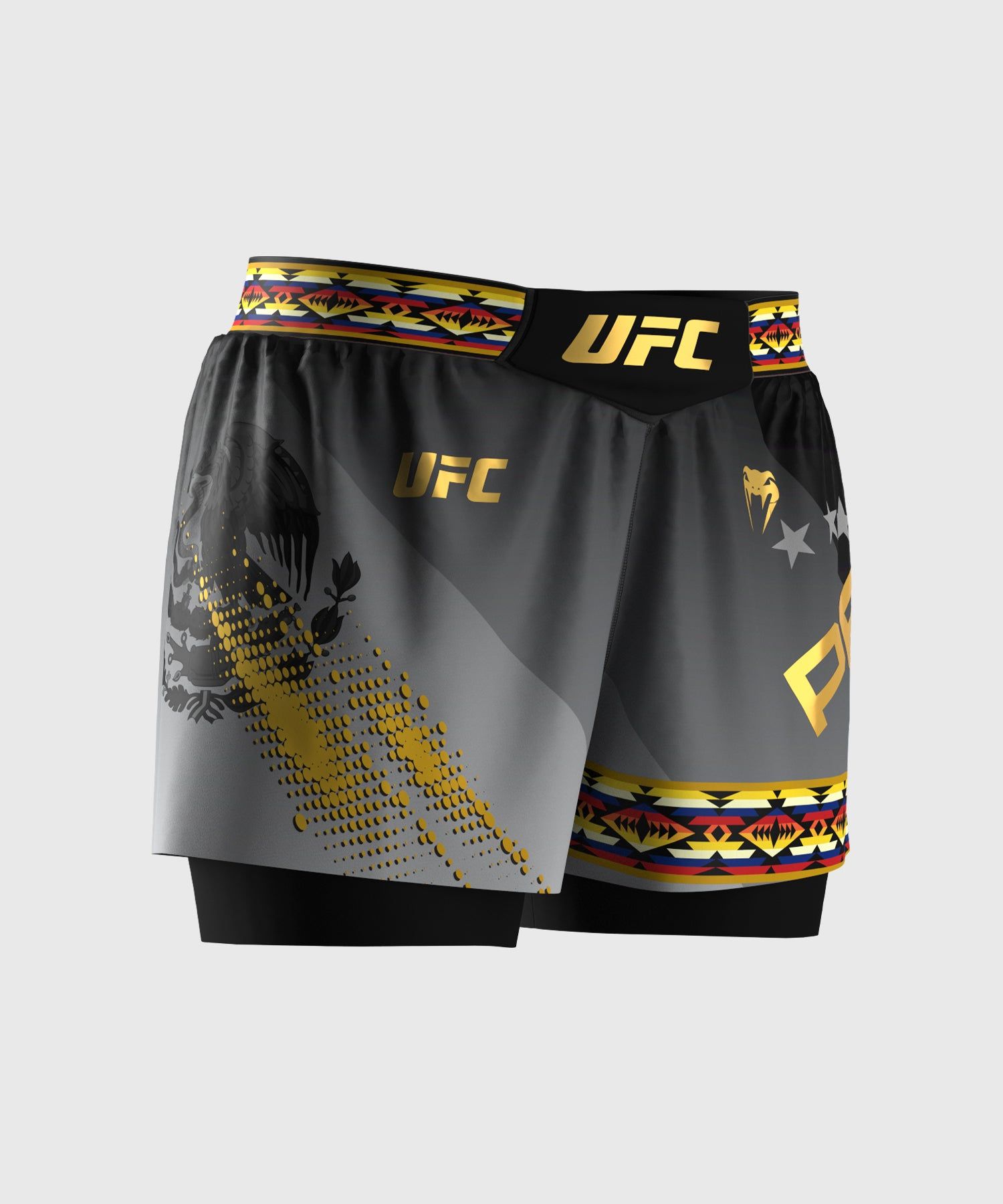 这款格斗短裤正是Julianna “The Venezuelan Vixen” Peña所穿的同款,采用弹性轻质面料制成,侧边采用热粘工艺开衩设计,确保运动灵活自由度。在设计过程中,佩尼亚从她的委内瑞拉、墨西哥和美国血统(包括美洲原住民 heritage)中汲取灵感,将各国国旗元素与阿兹特克风格图案巧妙融合。